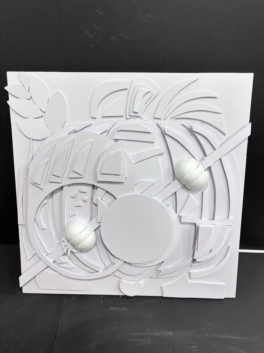 设计说明:这件三维构成作品以 “秩序与律动” 为核心,通过切割、叠加的白色块面与弧形线条,构建出层次分明的视觉节奏。中心圆形与环绕的几何线条形成稳定的视觉焦点,错落的镂空与凸起的球体打破平面感,营造出空间的呼吸感。统一的灰白色调弱化了色彩干扰,让观者更专注于形态、层次与光影的变化,整体呈现出理性秩序与动态韵律的平衡之美。