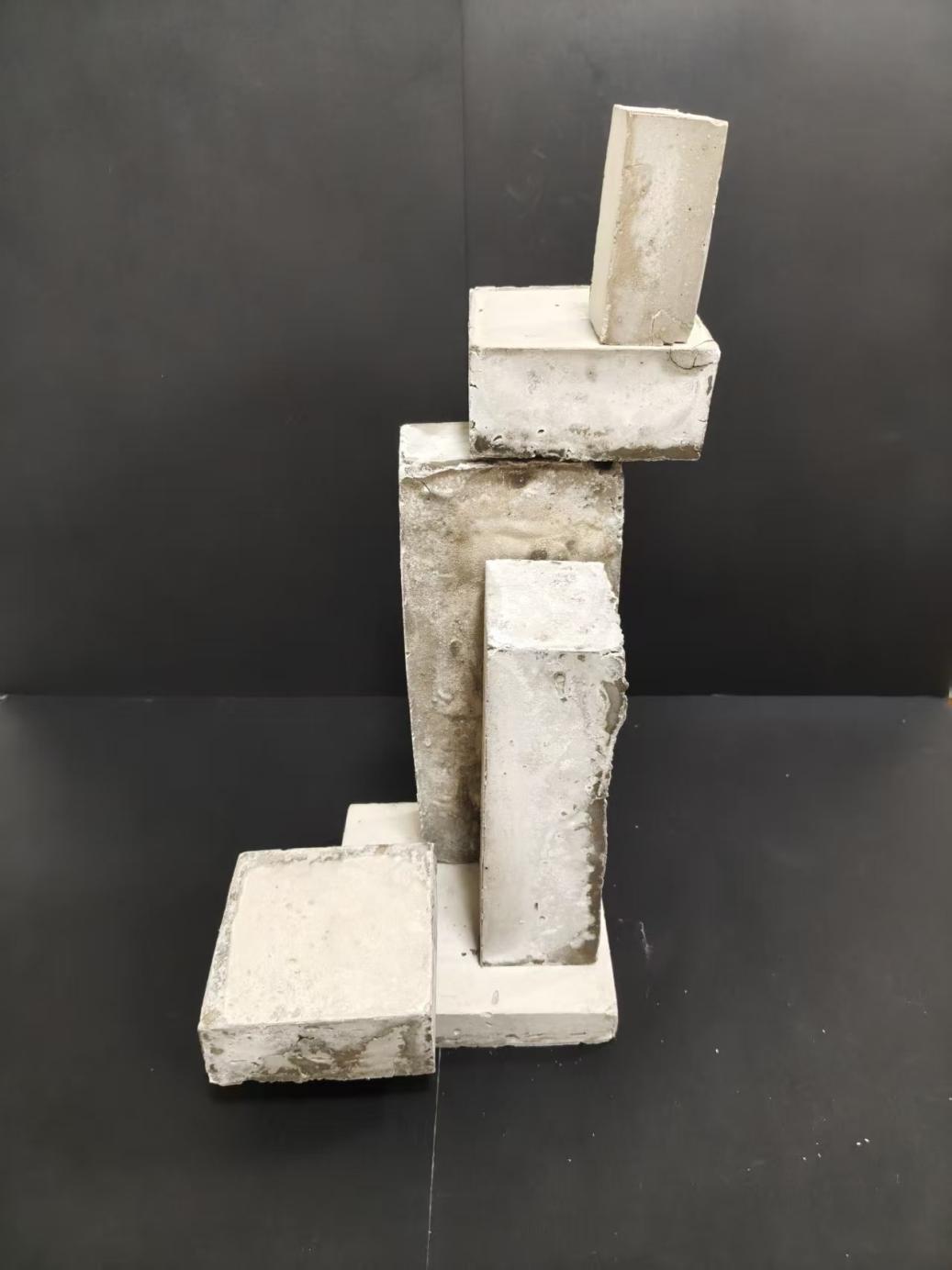 设计说明:本作品以混凝土块为核心材料,采用半立体构成的穿插、叠加、错落手法,将不同尺寸的几何块体进行组合。粗糙的混凝土肌理与硬朗的块面线条形成强烈对比,在视觉上营造出“平衡中带失衡”的张力。整体造型如微型建筑群落,通过块体的高低、前后关系塑造丰富的空间层次,传递出简约、沉稳且富有力量感的视觉语言,展现材料本身的质感与构成美学的秩序之美。
