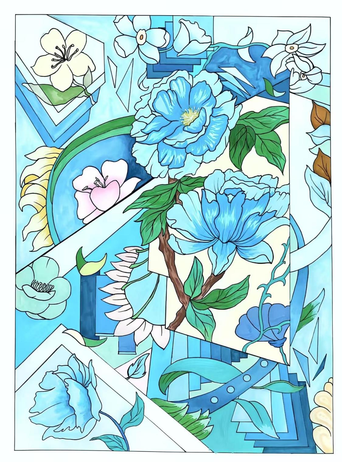 设计说明:本作品以牡丹等花卉为核心元素,采用蓝为主色调,通过不同明度的蓝色块面塑造层次,点缀绿色叶片与粉色小花。画面将写实花卉与几何线条、块面解构重组,融合手绘肌理与现代设计语言,探索传统植物纹样在当代视觉传达中的创新表达。