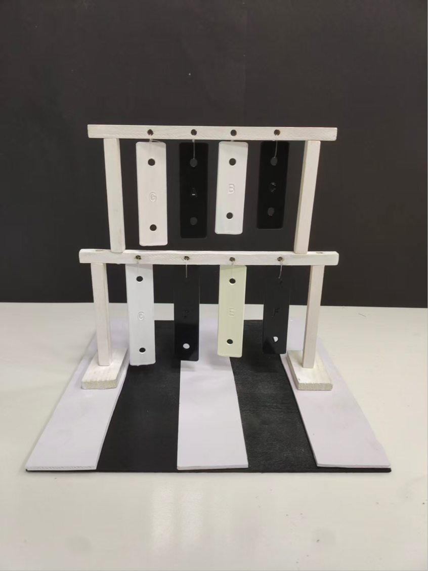 设计说明:本作品以黑白几何构成为核心创作语言,灵感源于城市建筑中的秩序与韵律,以及蒙德里安的抽象构成理念。采用木质框架搭建立体结构,通过横竖线条的交错,模拟建筑外立面的骨架感;悬挂的黑白(及浅米)板材以重复、对称的排列形成节奏,打破框架的静态,增添动态视觉层次。底座的黑白条纹与主体板材形成呼应,强化整体的秩序感与形式美。作品意在剥离具象建筑的细节,用纯粹的色彩与几何形态,探讨空间中线条、块面的组合关系,以及黑白对比带来的视觉张力与平衡感。