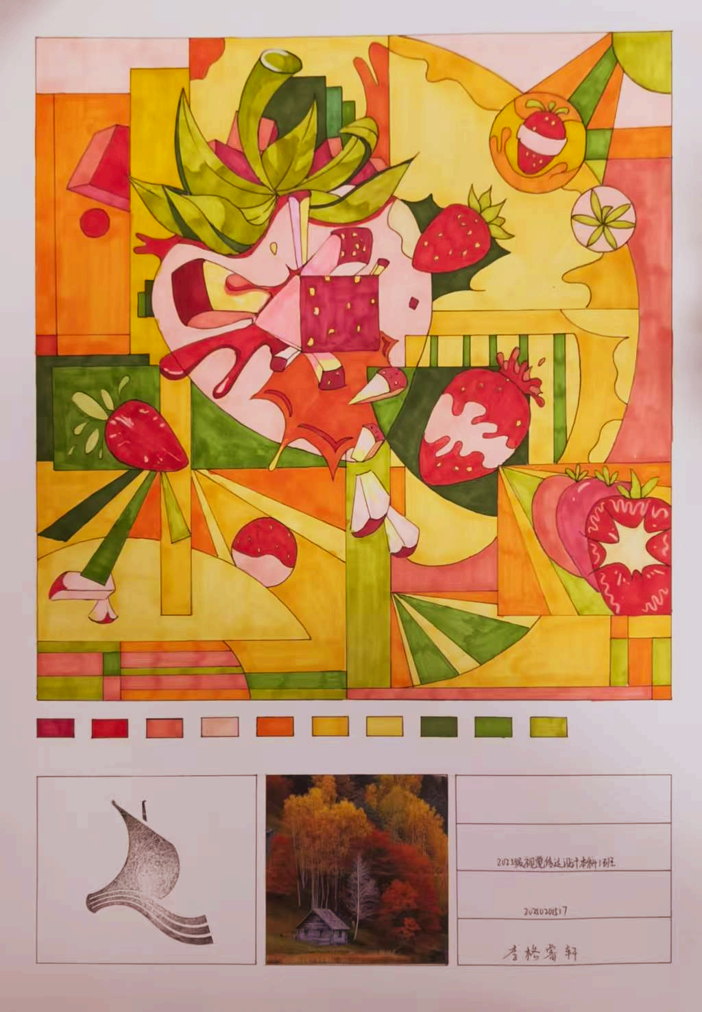 设计说明:这幅作品以“草莓”为主题,提取草莓的形态元素,用几何化的切割与重组,构建充满活力的视觉叙事。暖橙、明黄与粉绿的配色方案,表达温暖氛围,将草莓的鲜红果肉拆解为块面,嵌入硬朗的几何框架中,让有机形态与理性结构达成平衡。通过抽象化处理赋予画面现代设计感,传递出甜美、明快的视觉体验。