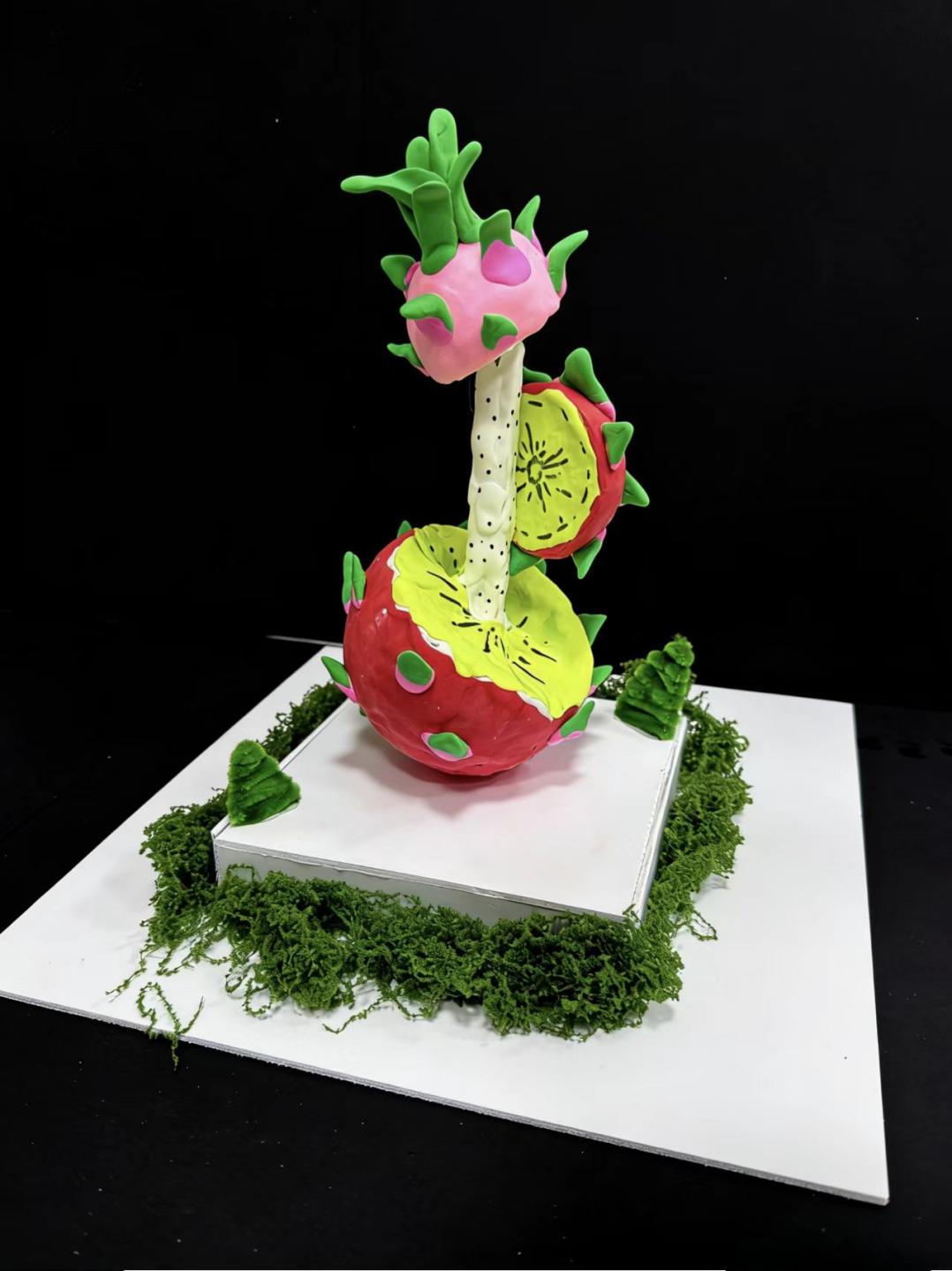 设计说明:本作品以火龙果为原型,采用累积构造手法完成三维创作,核心亮点在于火龙果到猕猴桃的形态变异。作品将三个不同形态的果体单元垂直叠加:底部是带玫红色外皮的半剖火龙果,中层单元保留火龙果的果皮特征,内部却变异为猕猴桃的放射状籽纹,顶部则是迷你粉火龙果,通过白色枝干串联成向上延伸的整体。累积构造带来了明显的视觉张力,形态变异则打破了单一物象的惯性。作品以火龙果的标志性特征建立视觉识别,又以猕猴桃的内部纹理制造惊喜,以苔藓基底进一步强化了自然生长的空间氛围,让自然形态与构成法则实现有机统一。