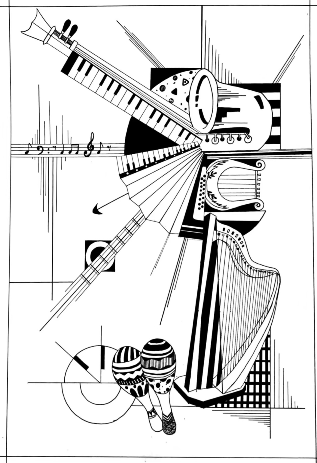 设计说明:这幅作品以“解构与重组的音乐韵律”为主题,采用黑白构成的视觉语言,将古典乐器元素进行几何化拆解与重构。整体构图通过倾斜的线条、放射状的块面与疏密有致的肌理,传递出爵士乐般的即兴动感,同时以理性的网格与分割平衡画面张力。