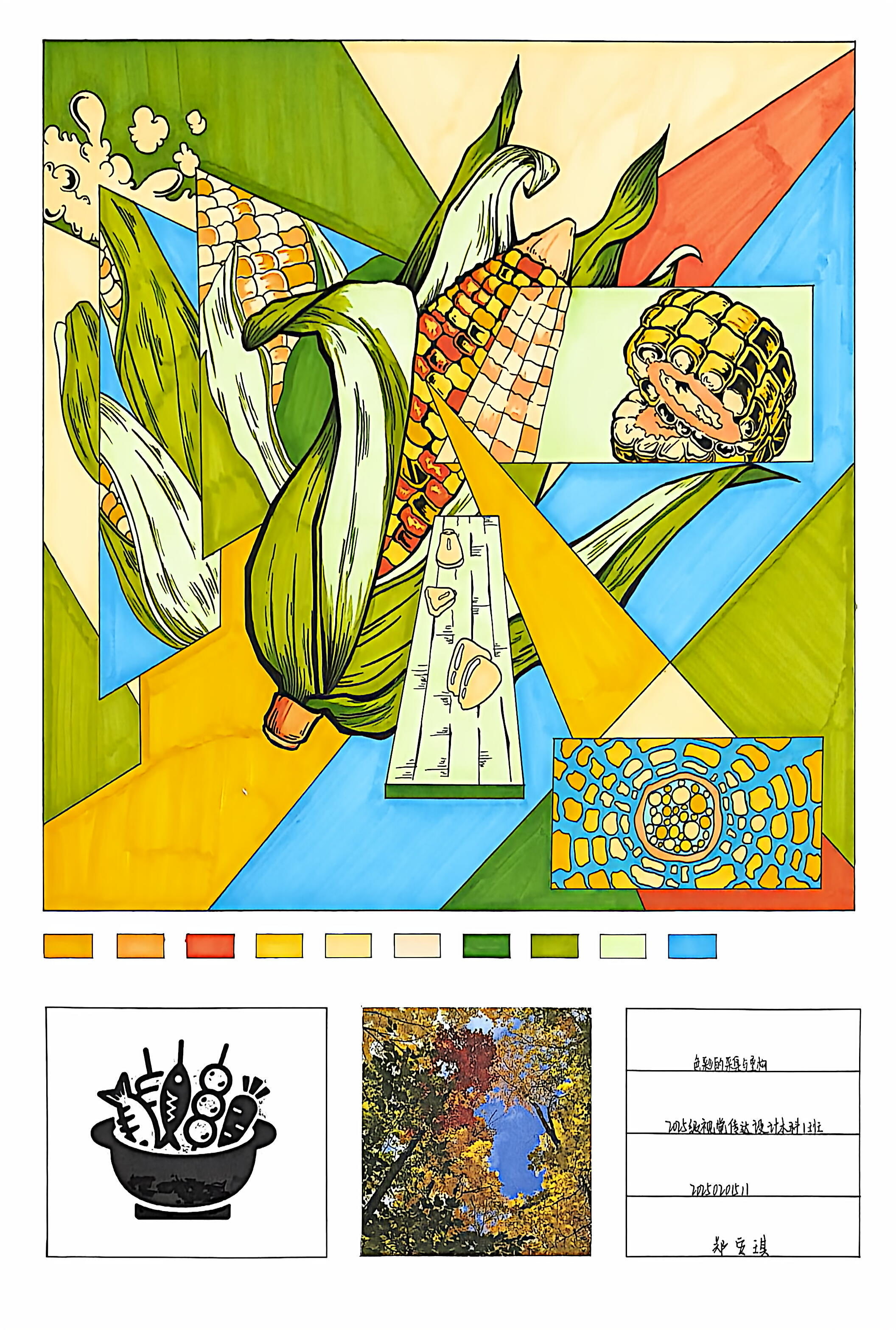 设计说明:作品以玉米为核心元素,通过分割、发射等构成手法,将玉米的形态、颗粒肌理与苞叶脉络进行抽象重构。画面以黄绿为主色调,搭配蓝、红等色块分割空间,结合放射状线条强化视觉张力,在保留玉米自然特征的同时,赋予其现代构成的秩序感与节奏感。