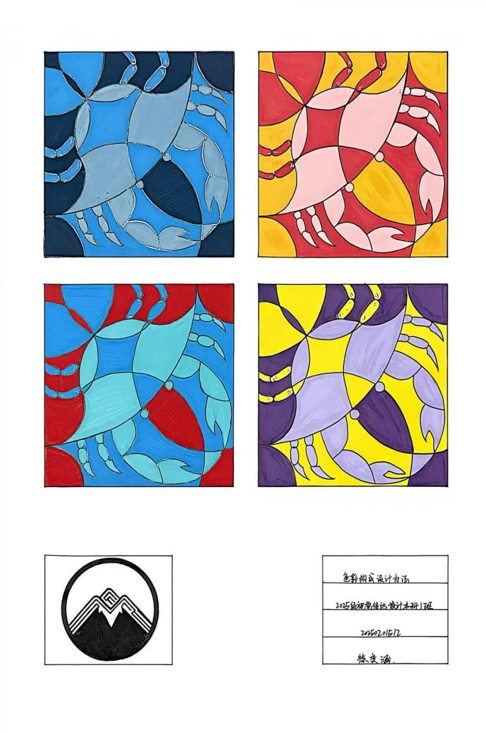 设计说明:作品采用“解构-重组”的构成方式,以黑色线条切割出不规则的有机块面,既保留了蟹形的辨识度,又通过抽象化处理赋予画面强烈的现代感。每幅作品均遵循色彩构成的核心原理,运用同类色渐变、邻近色搭配与互补色对比等手法,在统一的视觉框架下展现不同色调的表现力。
