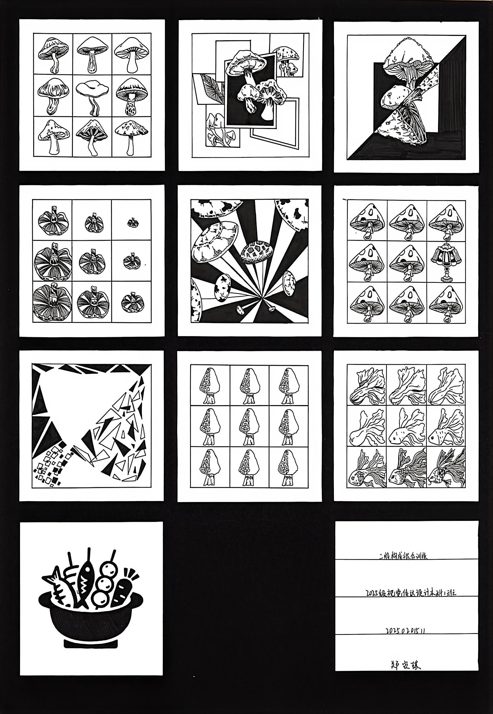 设计说明:这幅作品以蘑菇为核心元素,通过分割、近似、渐变等九种构成手法展开视觉实验。从网格阵列的秩序感,到放射状构图的张力,再到几何切割的抽象重构,将蘑菇的形态拆解重组,在黑白对比中探索自然形态与设计语言的多元融合,展现基础构成的丰富表现力。