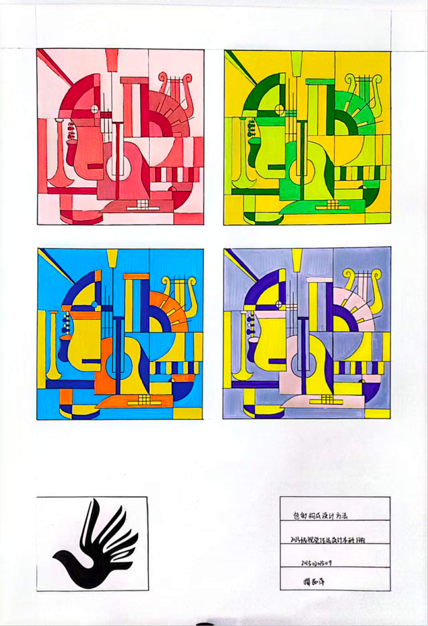 设计说明:本作品为色彩构成训练,以乐器抽象形态为核心元素,通过四组不同色调的配色方案探索色彩的情感表达与视觉张力。四幅画面均沿用同一几何结构的乐器轮廓,分别以暖红、黄绿、蓝橙、紫灰四组色彩进行填充,在统一的构图框架下对比不同色彩搭配的视觉效果。