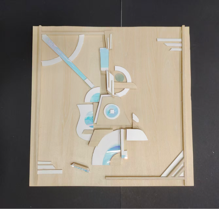 设计说明:这件作品为立体构成训练,以“轻透与层叠”为核心主题,通过木质基底、亚克力与卡纸的材质碰撞,探索空间层次与视觉节奏。浅木色基底提供了温润的视觉底色,白色卡纸切割出的几何形态与半透明的亚克力片相互穿插、叠加,在光线作用下形成朦胧的色彩晕染与虚实变化,弧形、直线与圆形元素的组合打破了规整感,错落的块面与倾斜的线条营造出轻盈的动态感,边角的几何装饰则平衡了整体构图。作品试图在极简的色彩与材质中,让平面元素产生立体呼吸感,诠释“轻”与“透”的视觉张力,展现构成设计中材质、形态与空间的共生关系。