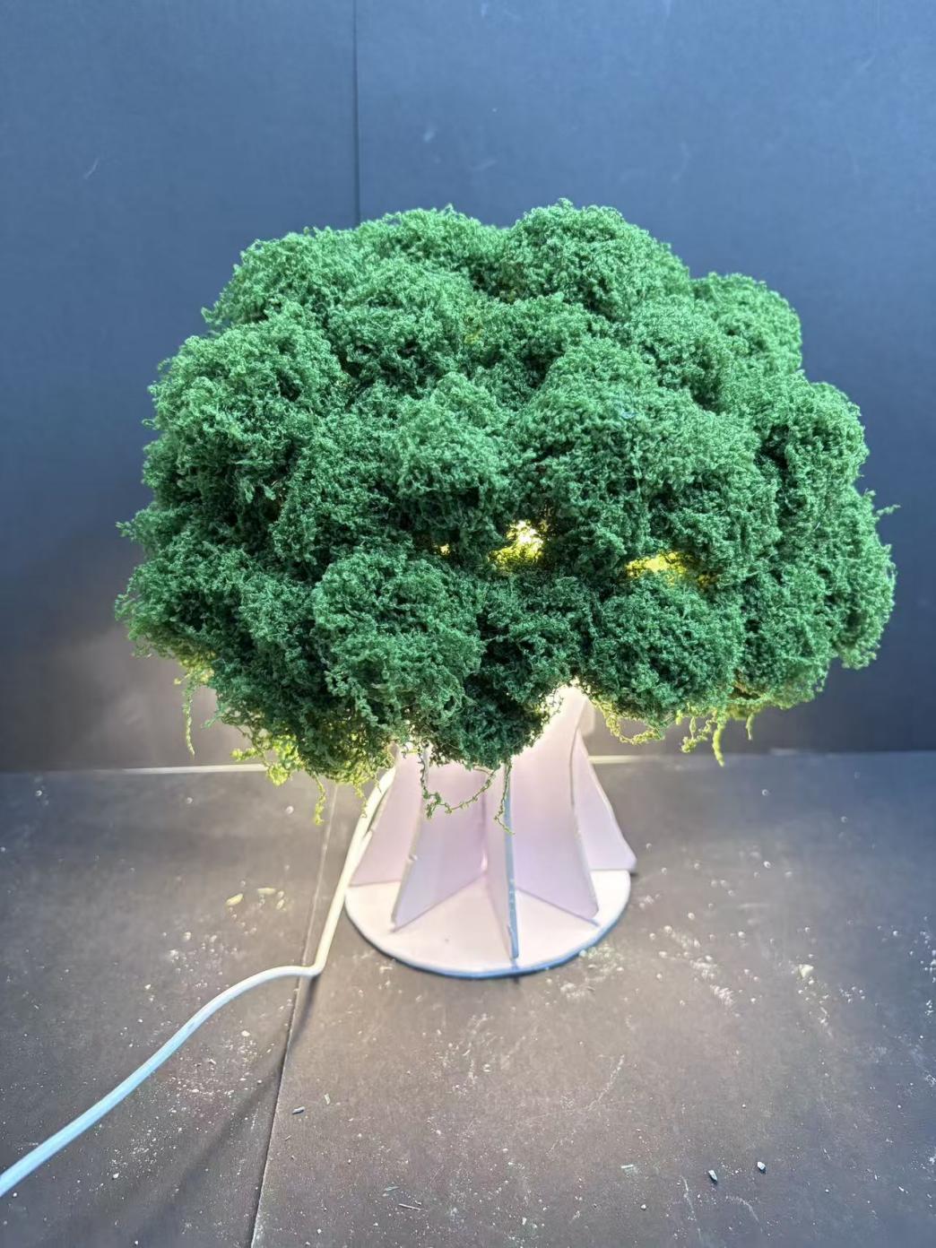 设计说明:这件三维构成作品以西蓝花为原型,将永生苔藓塑造成蓬松饱满的花球形态,还原其天然的肌理与团簇感。白色几何折叠底座模拟西蓝花茎部的支撑结构,内置光源从苔藓缝隙透出暖光,如同西蓝花在微光中展现鲜活生命力。作品通过仿生形态与功能结合,既保留了食材的视觉特征,又转化为兼具装饰性与实用性的装置,探索日常食材在艺术表达中的可能性。