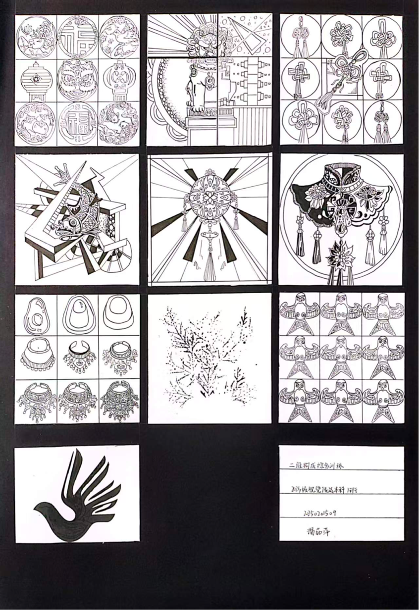 设计说明:本作品为二维构成综合训练,以中国传统视觉符号为核心元素,探索传统纹样在现代构成中的转译与表达。九宫格布局中,吉祥纹、中国结等传统符号被提炼为几何线条与装饰性图案,通过重复、对称、放射等构成法则重构,作品在理性构成与感性表达间取得平衡
