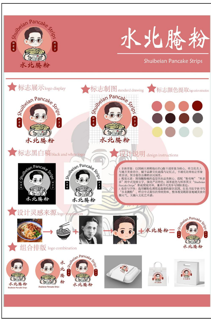 设计说明:1。主体形象:以国画大师傅抱石的Q版卡通形象为核心,将文化名人与地方美食结合,赋予品牌文化底蕴与记忆点,卡通化处理也让形象更亲切,契合餐饮品牌的亲民属性。2。视觉元素:围绕腌粉碗的造型突出品类核心,搭配"粉有味""料多多"的中式竖排文字,强化产品特色;圆形底色与环形英文"Shuibeian Pancake Strips"形成视觉闭环,兼具中式美学与国际表达。3。色彩与字体:选用暖粉色调营造温馨的餐饮氛围,红色书法字体书写"水北腌粉",呼应中式餐饮的传统韵味,整体视觉既彰显地域美食的烟火气,又融入文化艺术感。