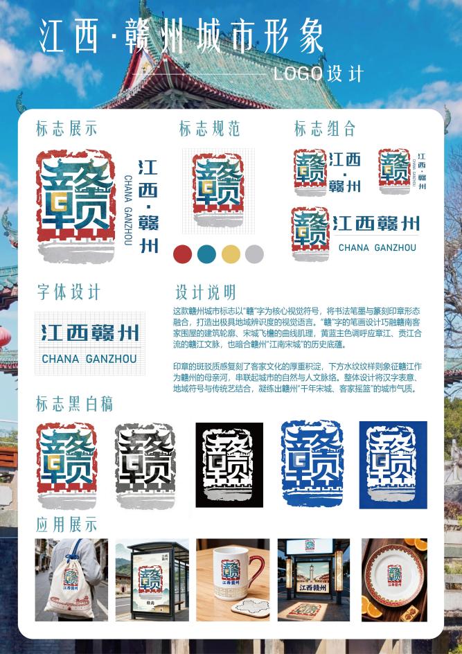 设计说明:这款赣州城市标志以"赣"字为核心视觉符号,将书法笔墨与篆刻印章形态融合,打造出极具地域辨识度的视觉语言。"赣"字的笔画设计巧融赣南客家围屋的建筑轮廓,宋城飞檐的曲线肌理,黄蓝主色调呼应章江,贡江合流的赣江文脉,也暗合赣州"江南宋城"的历史底蕴。印章的斑驳质感复刻了客家文化的厚重积淀,下方水纹纹样则象征赣江作为赣州的母亲河,串联起城市的自然与人文脉络。整体设计将汉字表意,地域符号与传统艺结合,凝练出赣州"千年宋城,客家摇篮"的城市气质。