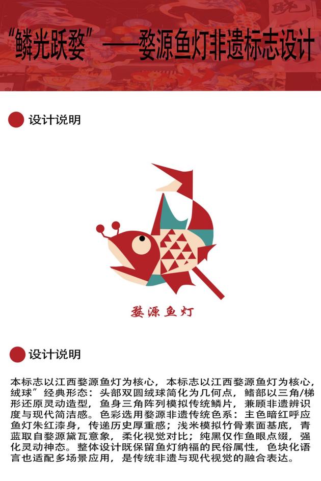 设计说明:本标志以江西婺源鱼灯为核心,绒球"经典形态:头部双圆绒球简化为几何点,鳍部以三角/梯形还原灵动造型,鱼身三角阵列模拟传统鳞片,兼顾非遗辨识度与现代简洁感。色彩选用婺源非遗传统色系:主色暗红呼应鱼灯朱红漆身,传递历史厚重感;浅米模拟竹骨素面基底,青蓝取自婺源黛瓦意象,柔化视觉对比;纯黑仅作鱼眼点缀,强化灵动神态。整体设计既保留鱼灯纳福的民俗属性,色块化语言也适配多场景应用,是传统非遗与现代视觉的融合表达。
