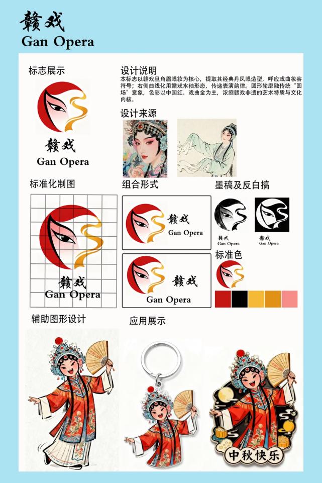 设计说明:本标志以赣戏旦角眉眼妆为核心,提取其经典丹凤眼造型,呼应戏曲妆容符号:右侧曲线化用赣戏水袖形态,传递表演韵律。圆形轮廓融传统"圆场"意象,色彩以中国红,戏曲金为主,浓缩赣戏非遗的艺术特质与文化内核。