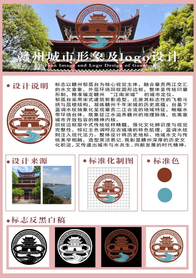 设计说明:标志以赣州郁孤台为核心视觉主体,融合章贡两江交汇的水文意象,外层环绕回纹圆形边框,整体呈传统印章形制,精准锚定赣州"江南宋城"的城市定位。郁孤台采用宋式建筑剪影造型,还原其标志性的飞檐斗拱与层楼结构,凝练赣州千年宋城的历史底蕴;台基下蓝调水纹抽象化呈现章贡二江合流的地域特征,蜿蜒水带环绕台体,既象征江水滋养赣州的地理脉络,也寓意城市开放包容的精神内核。回纹边框取中式传统纹样精髓,强化文化辨识度与视觉完整性,棕红主色调呼应古城墙的砖色肌理,蓝调水纹则注入现代活力。整体设计将历史地标,地域水文与传统美学相融,造型简洁易记,既彰显赣州深厚的历史文化积淀,又传递出城市与水共生,向新发展的时代精神。