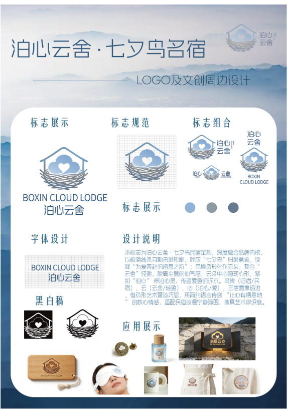 设计说明:本标志为泊心云舍。七夕鸟民宿定制,深度融合品牌内核。以极简线条勾勒鸟巢轮廓,呼应"七夕鸟"归巢意象,诠释"为爱奔赴的栖息之所";乌巢负形化作云朵,契合"云舍"轻盈,脱离尘嚣的仙气感;云朵中心隐现心形,紧扣"泊心"停泊心灵,传递爱意的诉求。鸟巢(归宿/民宿),云(云舍/轻盈),心(泊心/爱),三层意象递进借负形艺术营造巧思,用简约语言传递“让心有栖息地”的核心情感,适配民宿浪漫宁静氛围,兼具艺术辨识度。