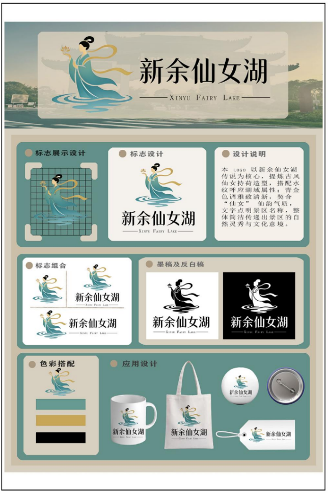 设计说明:本 LoGo 以新余仙女湖传说为核心,提炼古风仙女持荷造型,搭配水纹呼应湖域属性:青金色调雅致清新,契合仙女"仙韵气质,文字点明景区名称,整体简洁传递出景区的自然灵秀与文化意境。