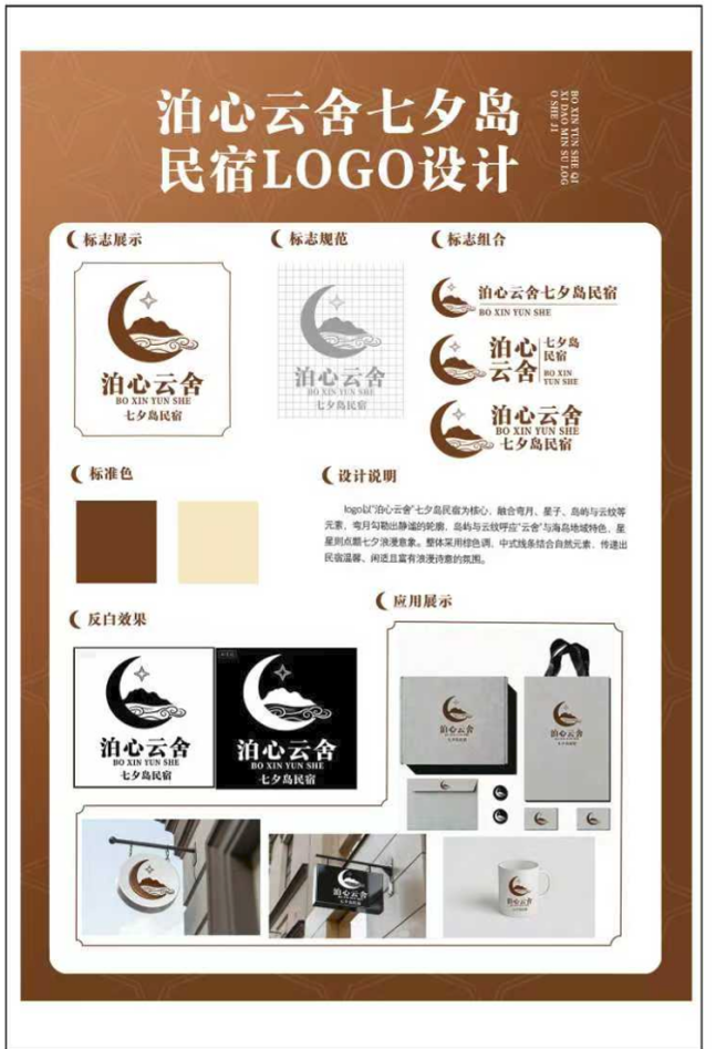 设计说明:logo以"泊心云舍"七夕岛民宿为核心,融合奇月,星子,岛的与云纹等元素,弯月勾勒出静谧的轮廓,岛屿与云纹呼应"云舍"与海岛地域特色,星星则点题七夕浪漫意象。整体采用棕色调,中式线条结合自然元素,传递出民宿温馨,闲适且富有浪漫诗意的氛围。