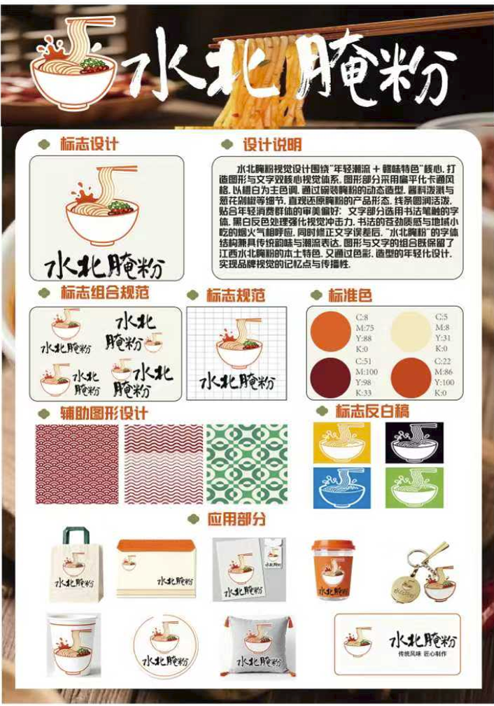设计说明:水北腌粉视觉设计围绕"年轻潮流+味特色"核心。打造图形与文字双核心视觉体系。图形部分采用扁平化卡通风格,以桃白为主色调,通过碗装腌粉的动态造型,酱料泼溅与葱花剁椒等细节,直观还原腌粉的产品形态,线条圆润活泼。贴合年轻消费群体的审美偏好:文字部分选用书法笔触的字体。黑白反色处理强化视觉冲击力。书法的苍劲质感与地域小吃的烟火气相呼应,同时修正文字误差后。"水北腌粉"的字体结构兼具传统韵味与潮流表达,图形与文字的组合既保留了江西水北腌粉的本土特色,又通过色彩,造型的年轻化设计。实现品牌视觉的记忆点与传播性。