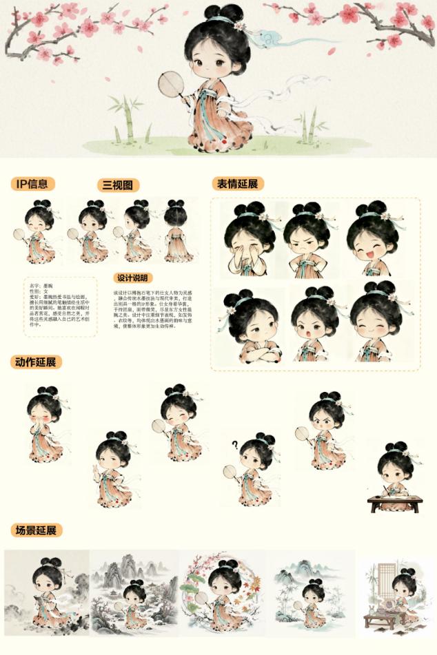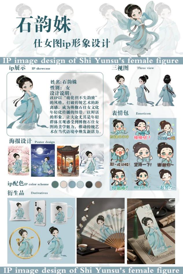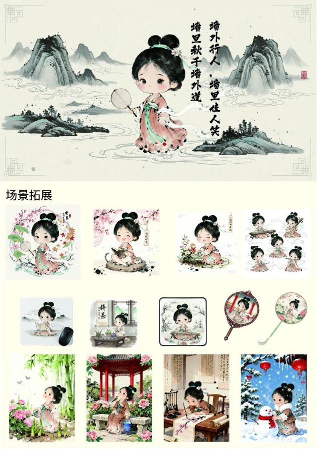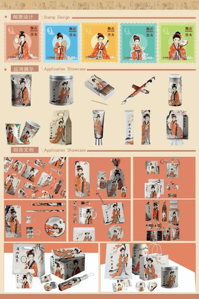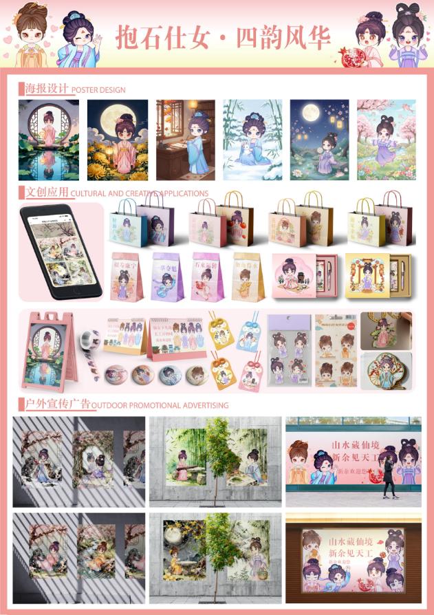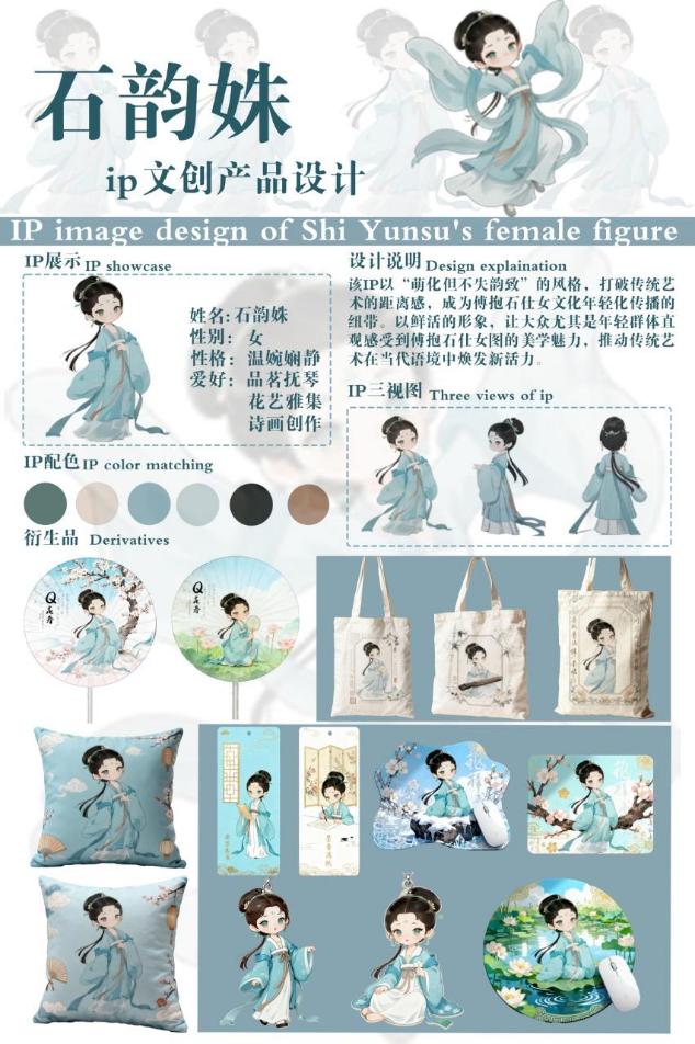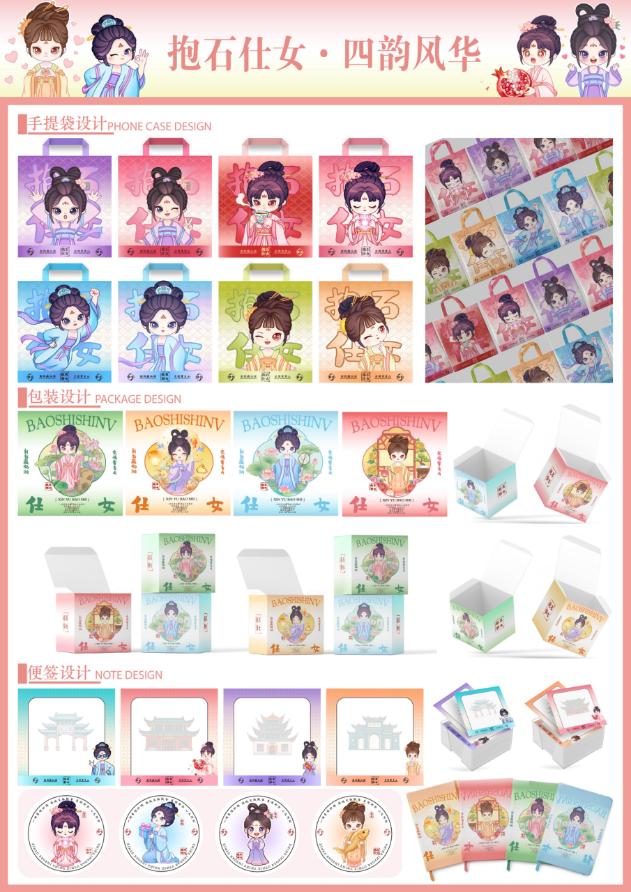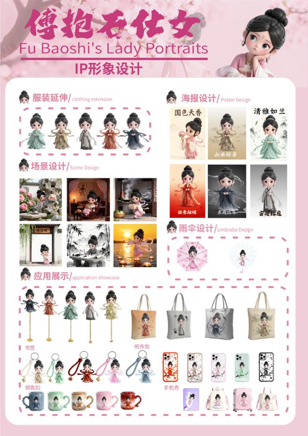 设计说明:本系列“石韵姝”仕女图IP设计,以傅抱石仕女文化为核心,通过“萌化+传统”的创新设计手法,构建了从IP形象、视觉体系到文创产品的完整生态。既坚守了传统艺术的美学内核,又以年轻化的表达打破了传统与现代的壁垒,让傅抱石仕女图从“博物馆的经典”走向“年轻人的日常”。