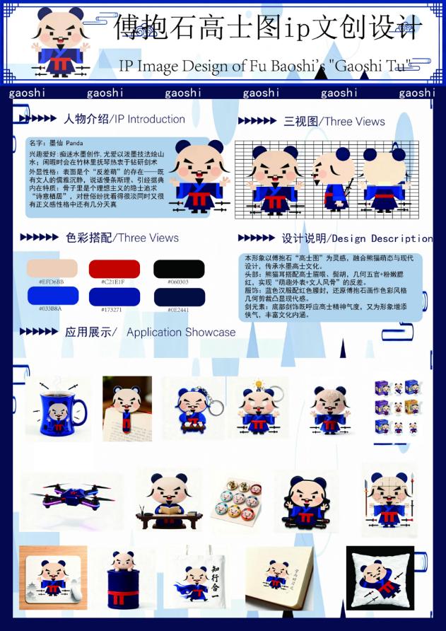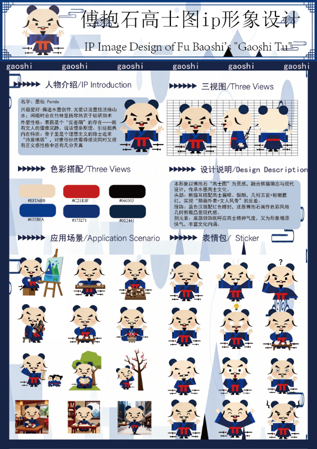 设计说明:本IP以傅抱石《高士图》为灵感,将传统文人画中“高士”的清雅风骨与熊猫的憨萌特质相融合。视觉上采用靛蓝、赤红、玄黑的传统配色,结合几何化的服饰形制,既保留了原作的文人气韵,又以现代卡通语言重构了“逍遥林泉、以墨为友”的高士形象。IP衍生出表情包、场景插画等多元应用,让千年文人意趣以更轻盈、亲和的姿态走进当代生活。