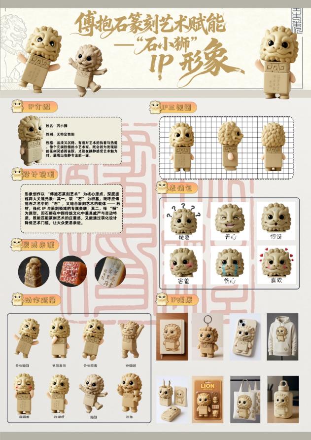 设计说明:本套作品以 “傅抱石篆刻艺术活化” 为核心命题,围绕 “石小狮” IP 展开全链路文创设计,旨在打破传统篆刻的专业壁垒,让百年文人艺术以亲和姿态走进当代生活。设计深度锚定傅抱石篆刻的两大文化基因:以 “石” 为根基,既呼应傅抱石之名,也以篆刻载体 “印石” 为视觉基底,将石材肌理、刀痕转化为 IP 的纹理细节;以 “狮” 为精神内核,提取传统石狮的威严意象,融合篆刻的方正线条,保留镇护瑞兽的文化属性。