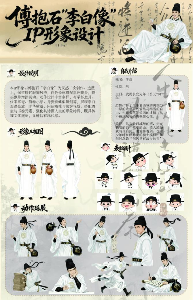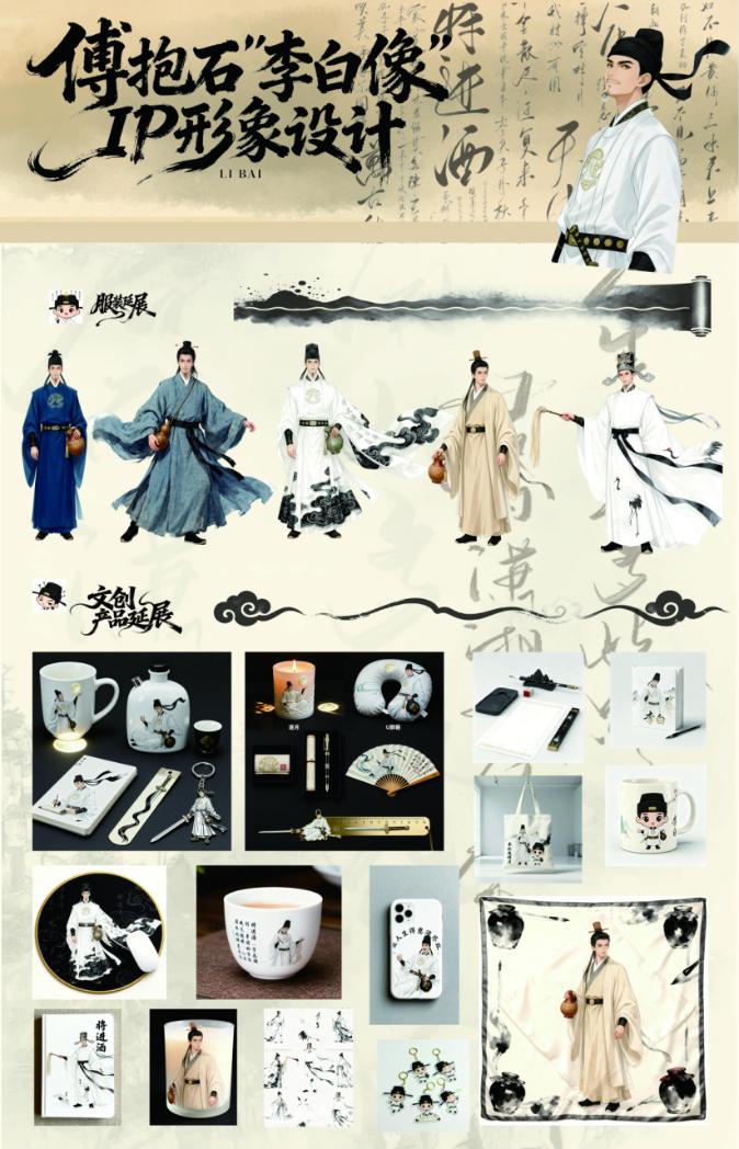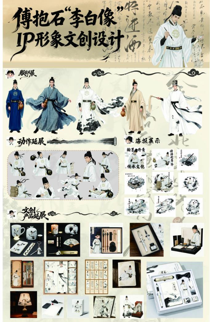 设计说明:本IP形象以傅抱石“李白像”为灵感二次创作。造型上,保留唐代服饰风格,白色长袍搭配黑色幞头,幞头飘带增添灵动。动作设计丰富多样,有举杯邀月、伏案挥毫、倚卷小憩、身姿矫健似舞剑等,展现李白浪漫豪放、才华横溢、闲适随性与侠客气质。搭配酒壶与书卷元素,强化其诗酒人生的形象特质,既具传统文化底蕴,又鲜活有现代感。江小白李白文创洒包装设计,以青花艺术为载体,融合诗仙李白饮洒、作诗的经典形缘,将“人生得意须尽欢”“天生我材北有用”等干古诗句与品牌“我有一瓶洒有话对你说”的理念深度结合。