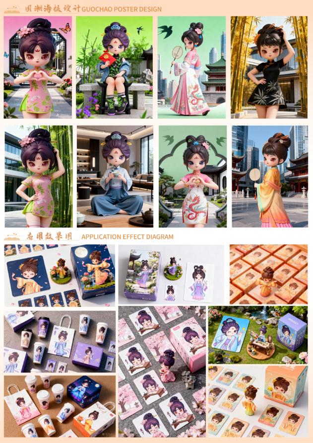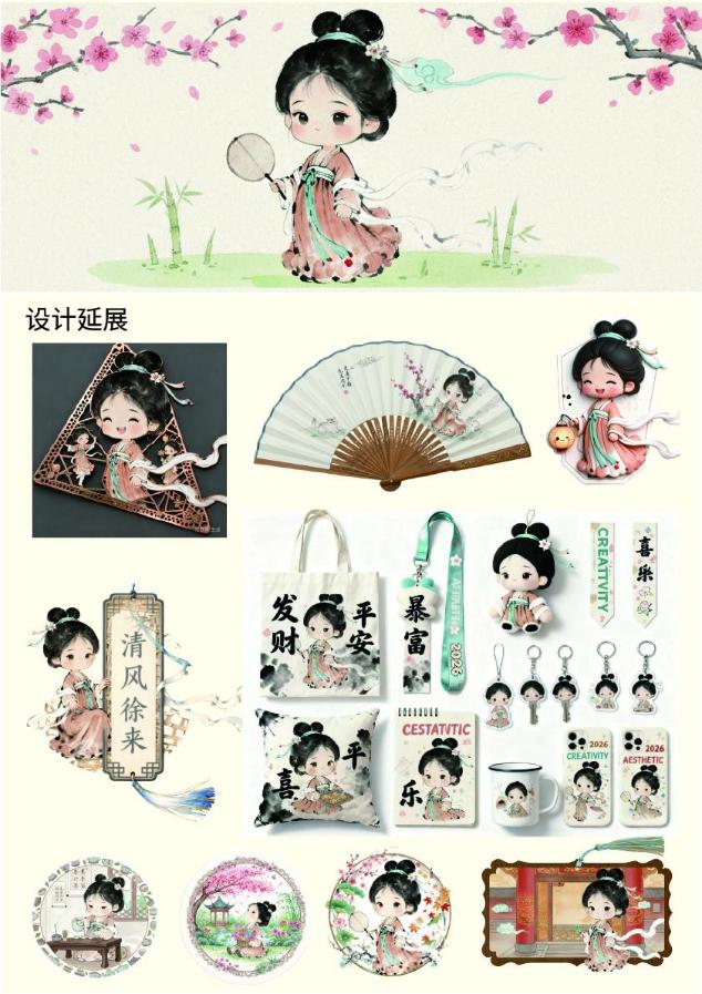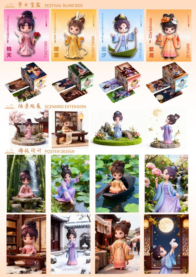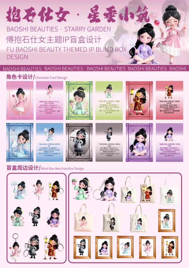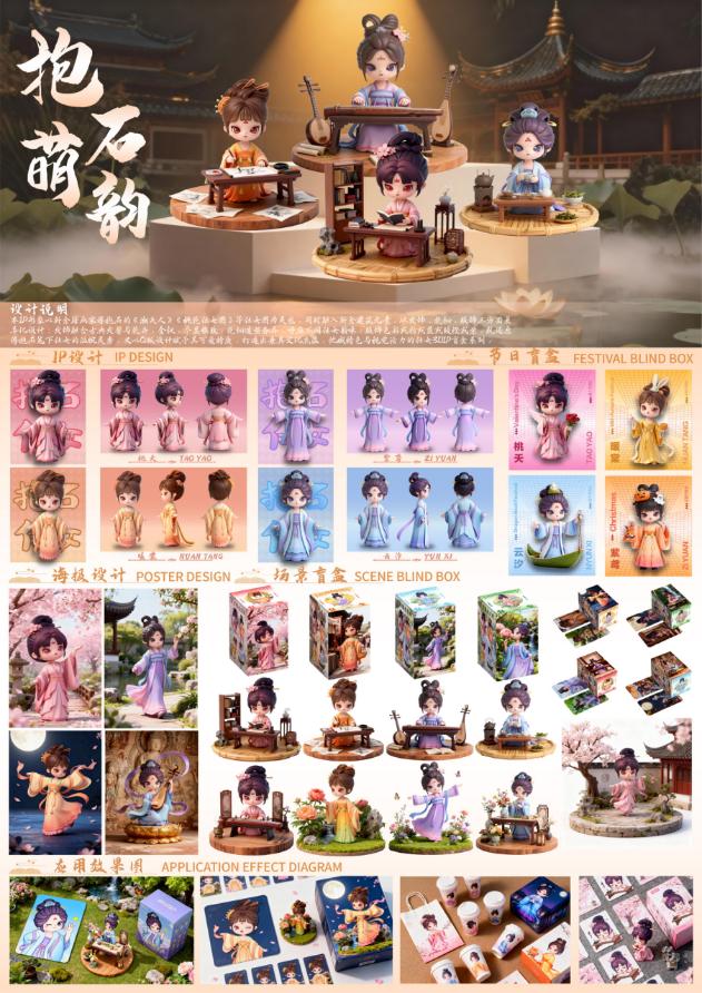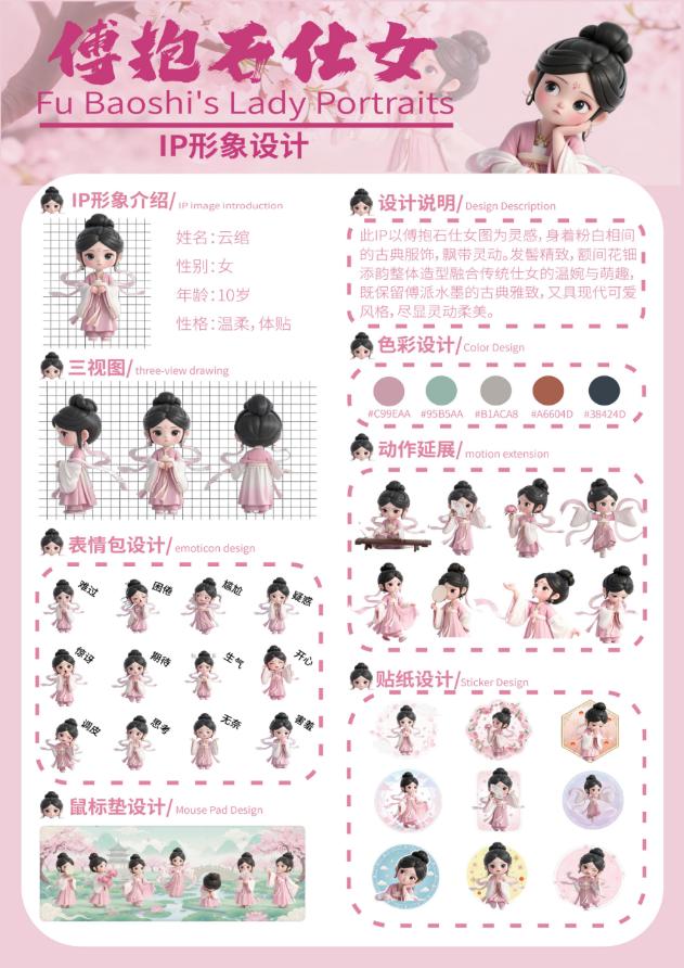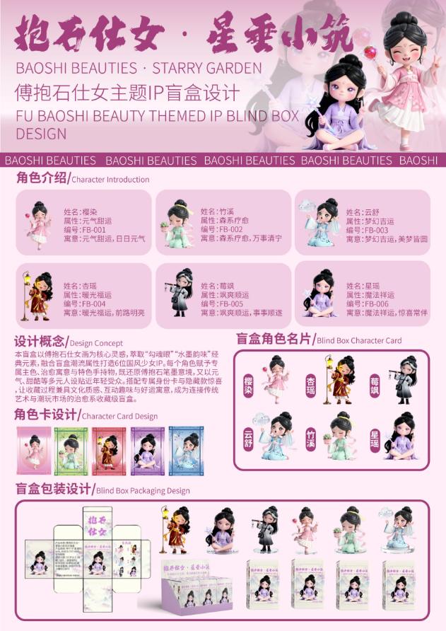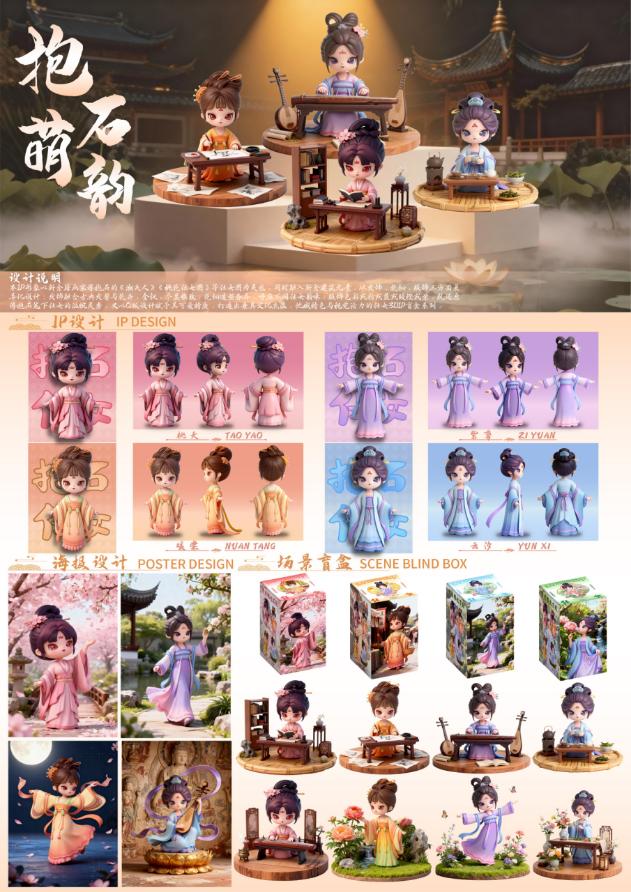 设计说明:本系列以傅抱石仕女图为灵感,融合水墨气韵与现代潮玩美学,打造 “抱石仙女・星垂小筑” 盲盒与 “云绾” IP 形象。盲盒推出 6 位国风少女形象,赋予元气、疗愈等美好寓意;IP 形象则以粉白古典服饰搭配灵动发饰,通过表情包、贴纸等衍生设计,让传统仕女的温婉雅致在当代潮流中焕发新生,成为连接传统艺术与年轻受众的治愈载体。