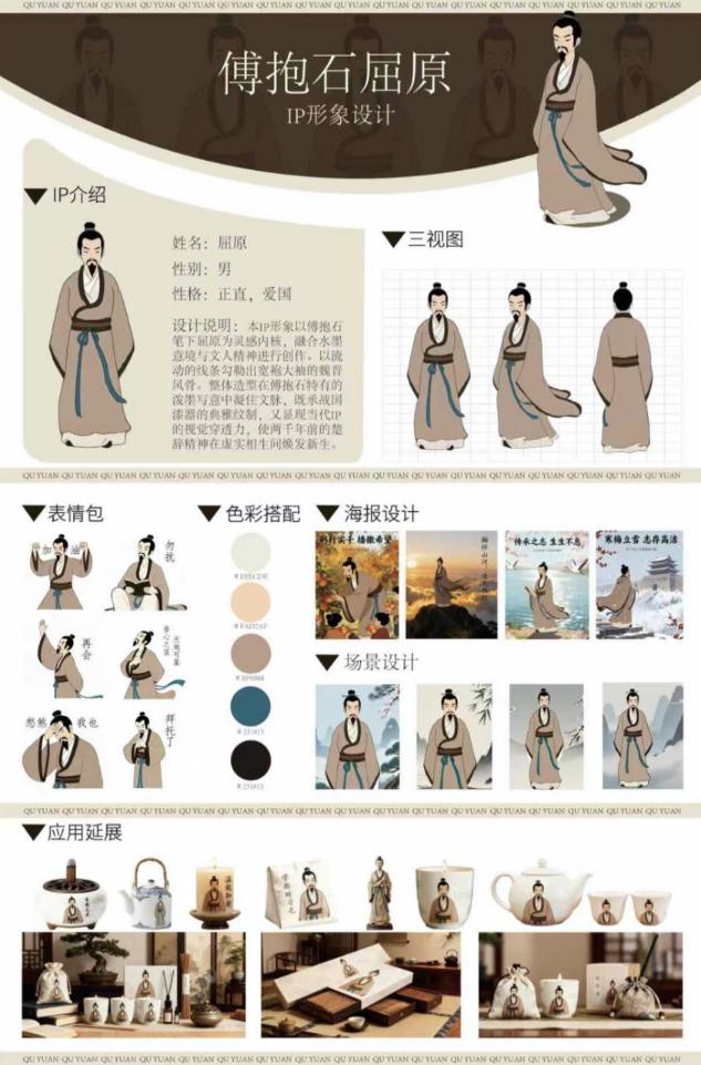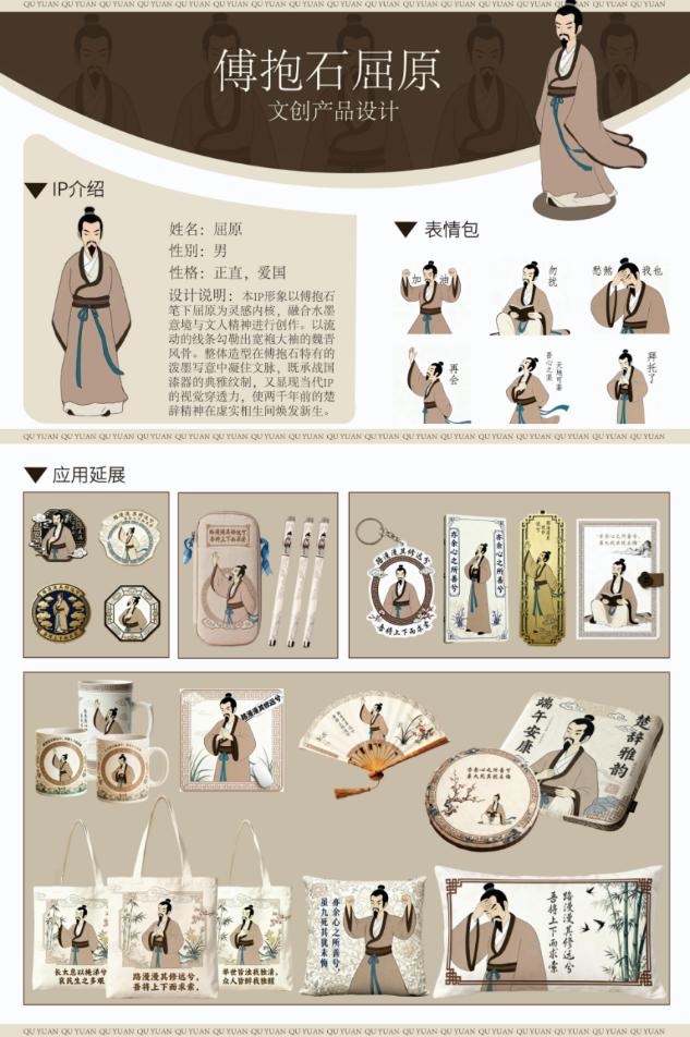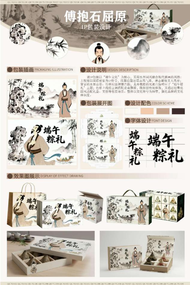 设计说明:本系列设计以傅抱石笔下屈原为灵感内核,融合水墨意境与文人精神创作,以流动线条勾勒宽袍大袖的魏晋风骨,在泼墨写意中凝住文脉,既承战国漆器的典雅纹制,又具当代IP的视觉穿透力,让楚辞精神在虚实间焕发新生。配套包装以“端午文化”为核心,水墨国风融合现代插画,以屈原为IP符号,搭配水墨山石、竹林与龙舟载粽元素呼应“端午粽礼”主题。