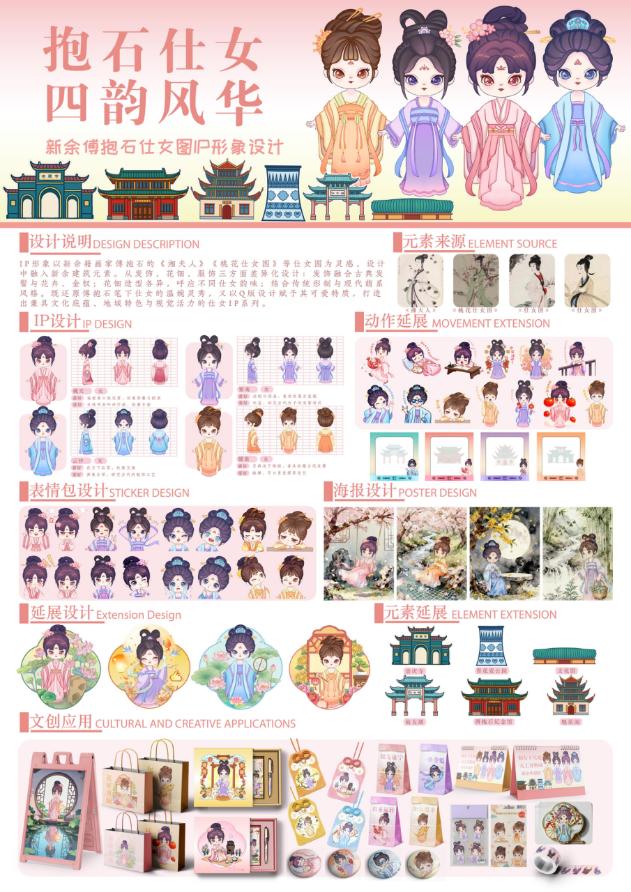 设计说明:这两组IP形象均以新余籍画家傅抱石的《湘夫人》《桃花仕女图》等仕女图为灵感,同时融入新余建筑元素。从发饰、花钿、服饰三方面差异化设计:发饰融合古典发髻与花卉、金钗,尽显雅致;花钿造型各异,呼应不同仕女韵味;服饰色彩或粉或蓝或暖橙或紫,结合传统形制与现代萌系风格,还暗藏新余建筑的形制细节。既还原傅抱石笔下仕女的温婉灵秀,又以Q版设计赋予其可爱特质,打造出兼具文化底蕴、地域特色与视觉活力的仕女IP系列。