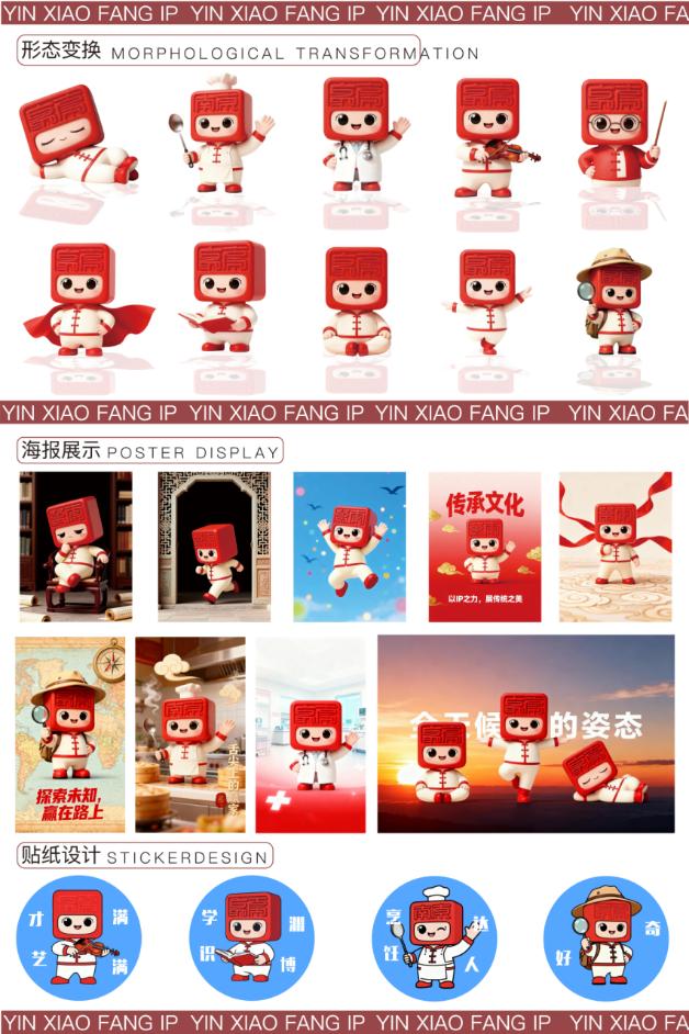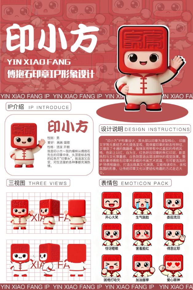 设计说明:“印小方”IP形象设计,其头部以印章为造型核心, 印面文字等元素经艺术化提炼呈现,既保留印章的标志性特征,又增添了卡通的萌趣感。服饰采用带有中式盘扣的传统风格,色彩上以红、白为主,红色呼应印章的朱红印泥,彰显热烈与文化厚重感,白色则营造出简洁明快的视觉效果。整体形象将傅抱石印章所承载的书画艺术底蕴,与可爱活泼的 IP 特质相融合,打造出既具文化渊源,又能传递欢乐、亲和氛围的形象,让传统印章文化以更轻松有趣的方式走近大众。
