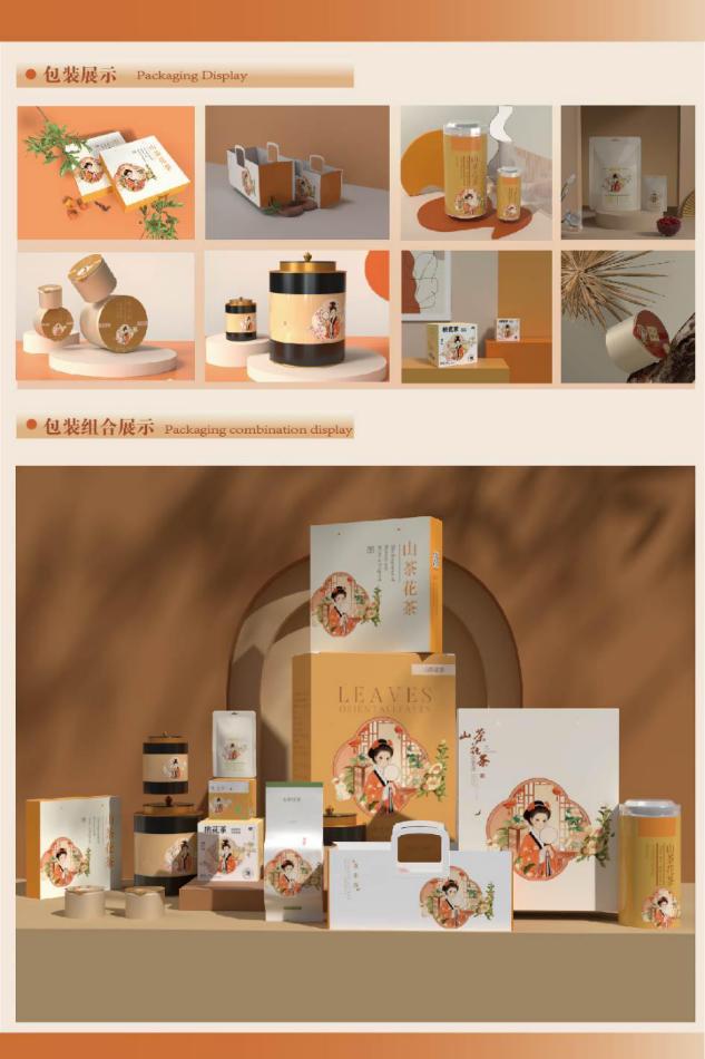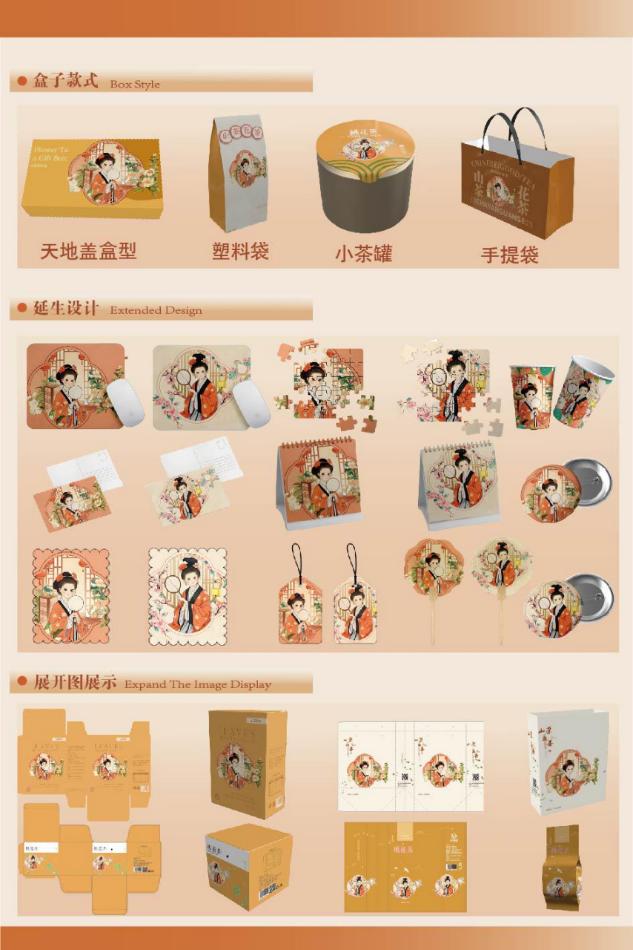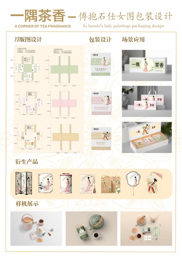 设计说明:本花茶包装以傅抱石仕女图为视觉核心,提取仕女温婉的神态与古典线条,融合花卉元素呼应花茶属性。色彩选用低饱和的米,粉,绿等雅致色调,贴合中式美学意境;文案以"一隅茶香"为核心,搭配"甘润入心""浮生半日"等语,既延续傅抱石画作的文人气韵,又传递花茶舒缓,清甜的饮用体验,让传统美学与茶饮生活相融。