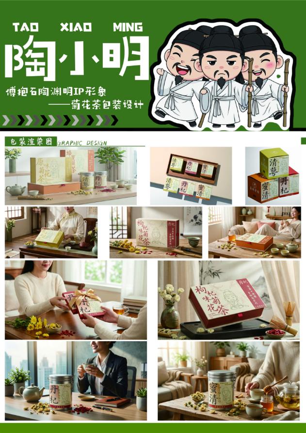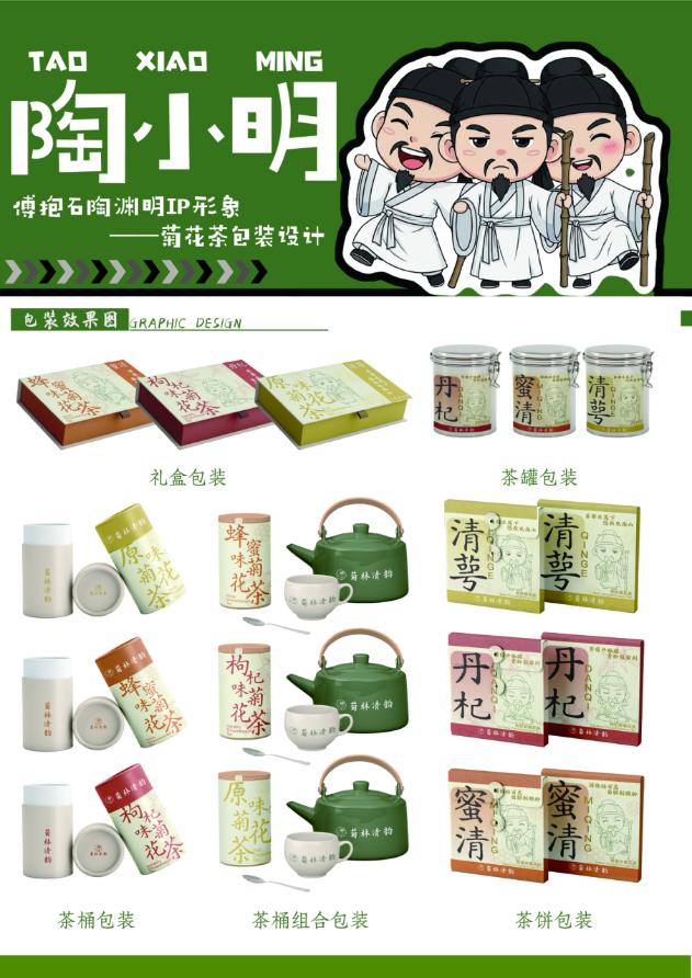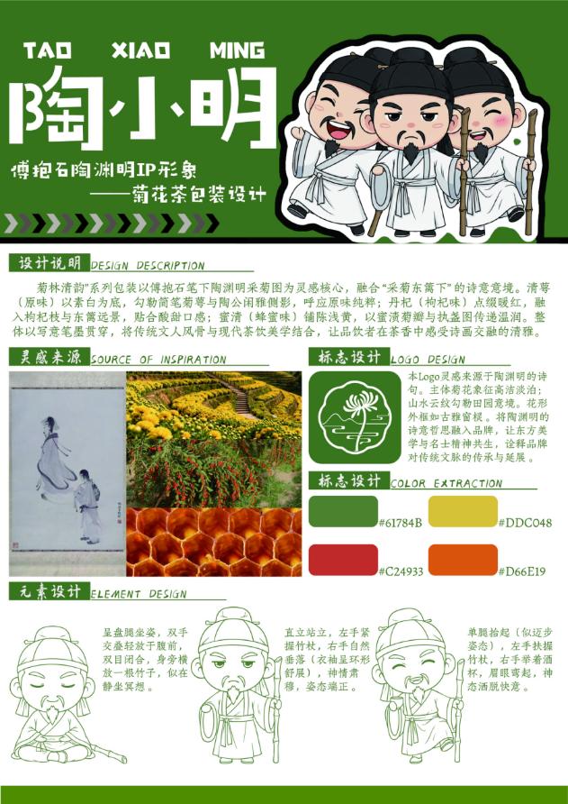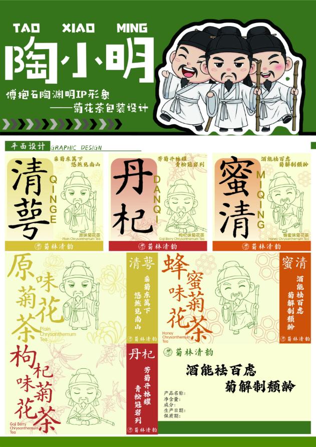 设计说明:本系列作品以傅抱石笔下陶渊明形象为灵感,打造Q版IP“陶小明”,提取古冠、竹杖等元素还原文人风骨。围绕菊花茶打造清萼、丹杞、蜜清三款包装,以写意笔触融合“采菊东篱”意境,让传统诗意与现代茶饮共生,传递清雅悠然的品茗体验。