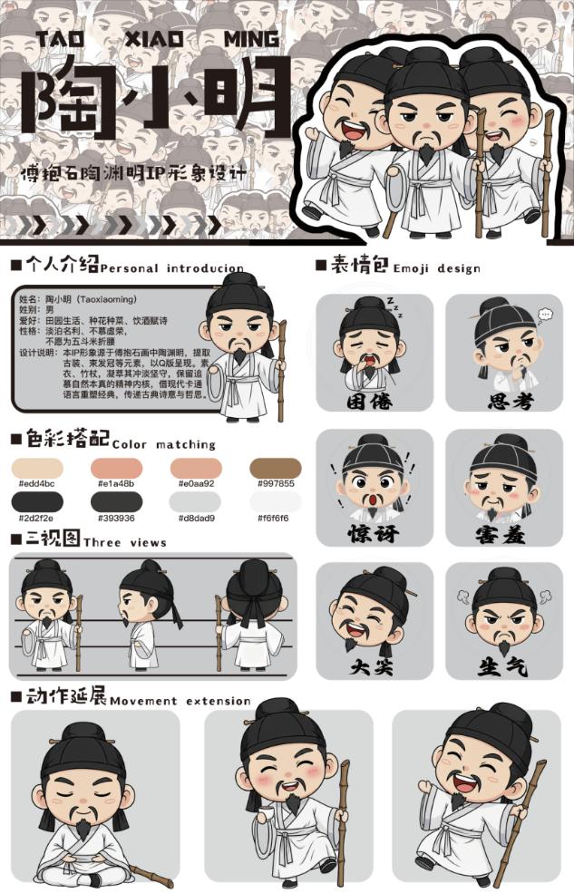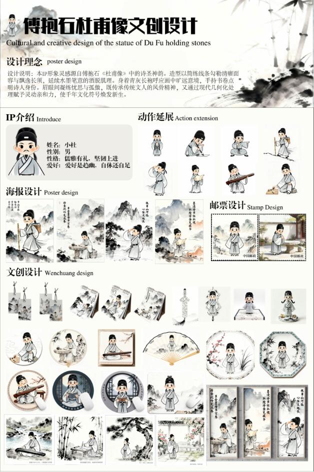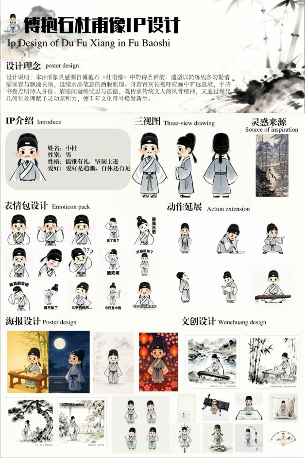 设计说明:本系列作品以傅抱石《杜甫像》为灵感源,提炼诗圣忧国忧民的精神内核与文人风骨,打造出兼具传统韵味与现代亲和力的“小杜”IP形象。设计将水墨写意的线条与几何化造型结合,衍生出表情包、动态海报、文创周边及应急产品包装等多元应用。在延续水墨美学的同时,通过IP的柔性表达让千年文化符号走进日常,更以应急包装为载体,传递“民胞物与”的人文关怀,实现文化价值与实用功能的深度统一。