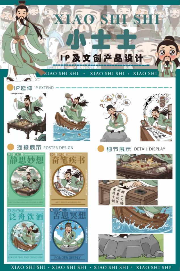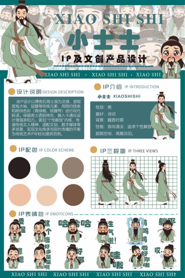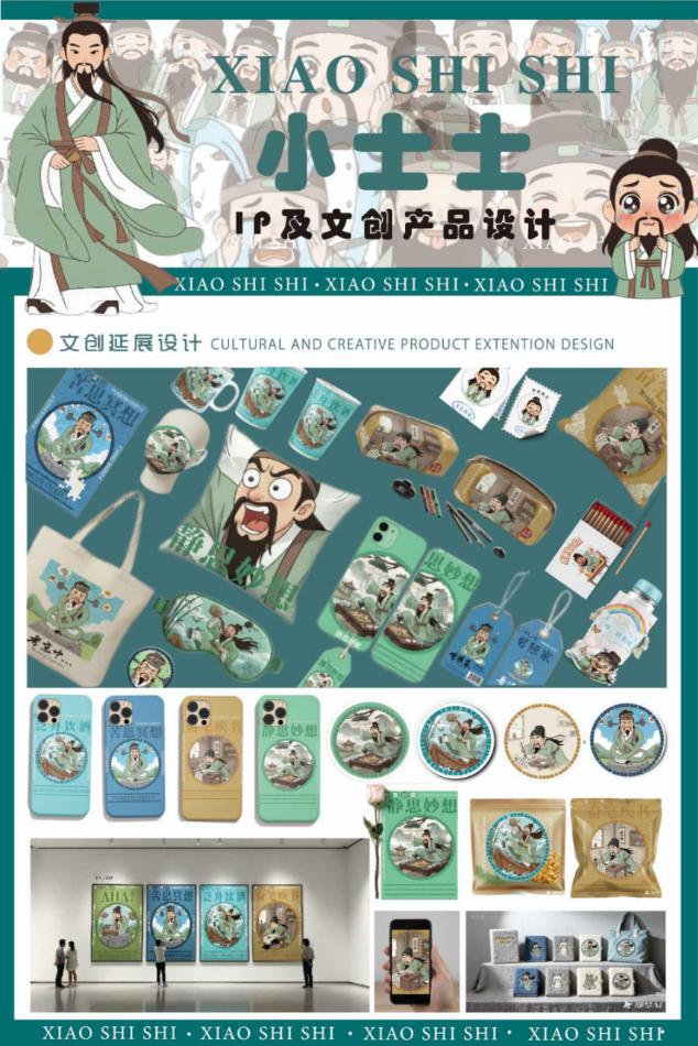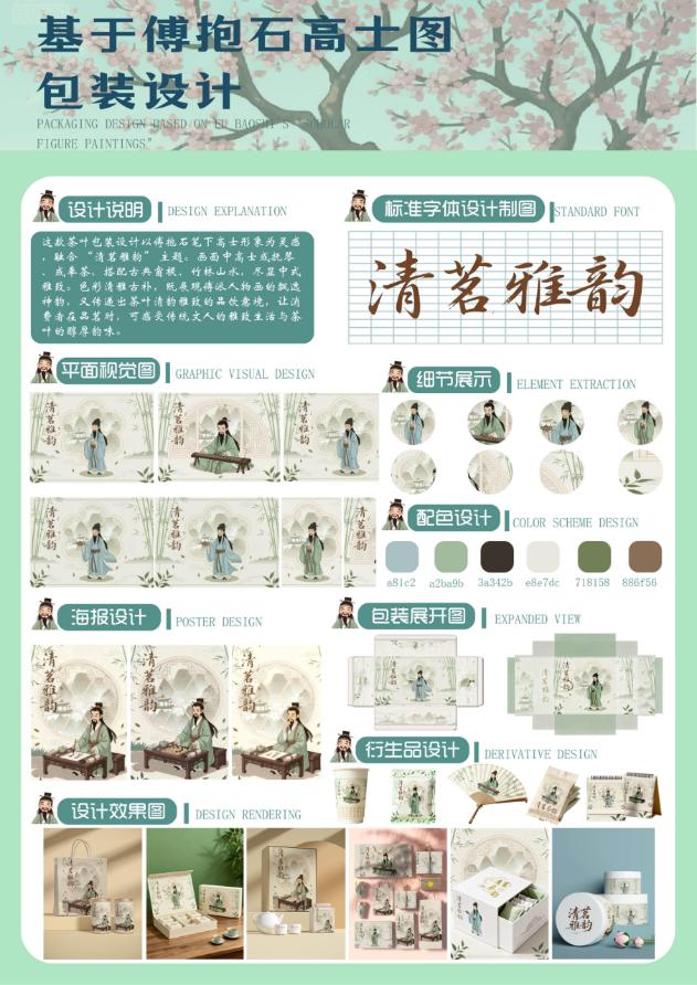 设计说明:这两组设计均以傅抱石笔下“高士”为核心灵感。前者打造“清茗雅韵”茶叶包装,将高士抚琴、品茗的文人雅趣融入包装视觉,以清雅色调传递中式雅致;后者推出“小士士”IP,通过卡通化转译,赋予魏晋高士亲和的现代形象,二者共同实现传统文人精神在当代设计中的活化与传播。