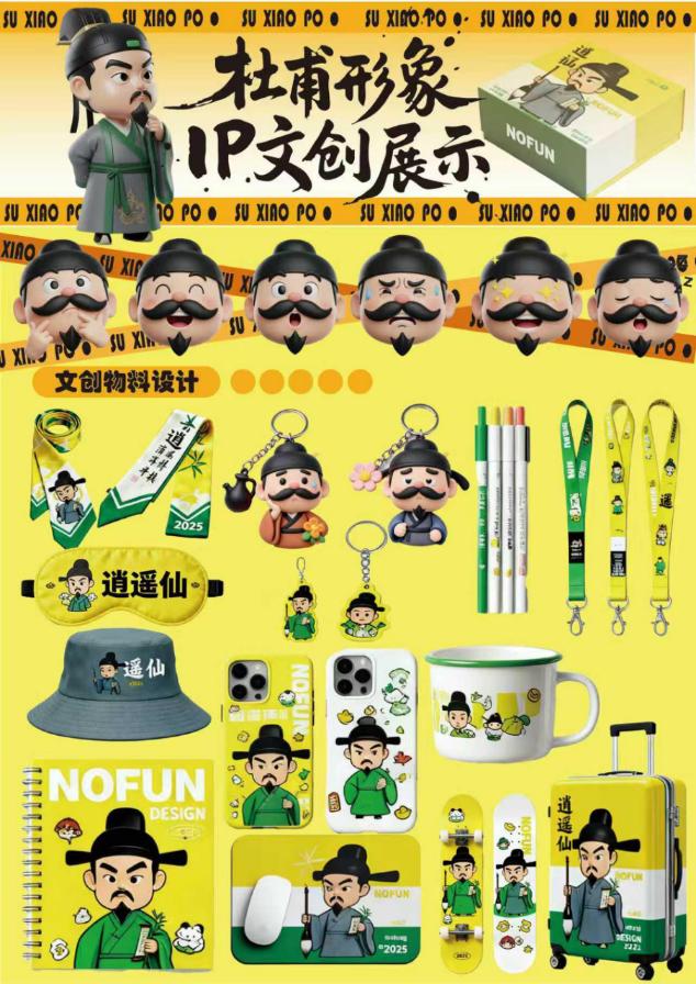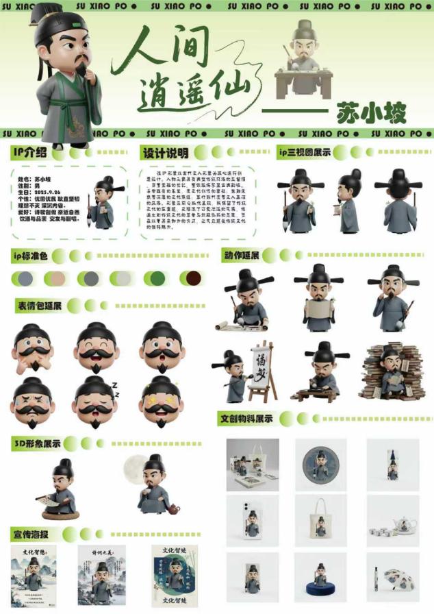 设计说明:本系列文创 IP 以 “唐宋双贤” 苏轼与杜甫为核心,将文人风骨与现代潮玩美学融合重构。“苏小坡” 以 “人间逍遥仙” 为定位,用松弛的神态、青绿主色调传递苏轼豁达通透的人生态度;“杜甫” 形象则以沉稳灰绿为基底,保留文人儒雅气质的同时,通过 Q 萌化表情与夸张动作消解历史厚重感。