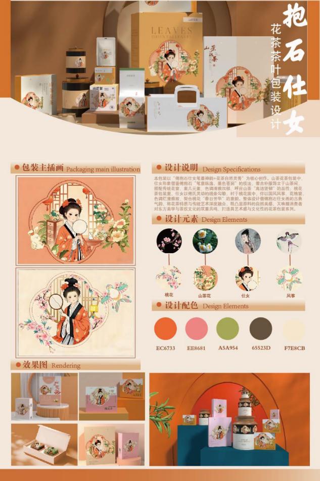 设计说明:本系列作品以傅抱石仕女画为文化内核,融合水墨写意气韵与现代审美,打造Q版仕女IP。提取暖橙、柔粉、茶绿等雅致色系构建视觉体系,搭配团扇、茶花、窗棂等东方元素,构建兼具古韵与现代感的视觉体系。产品覆盖文创全品类与花茶包装,让传统美学与实用功能共生,使傅抱石笔下的仕女文化,在日常消费场景中实现雅致转译与鲜活传承。