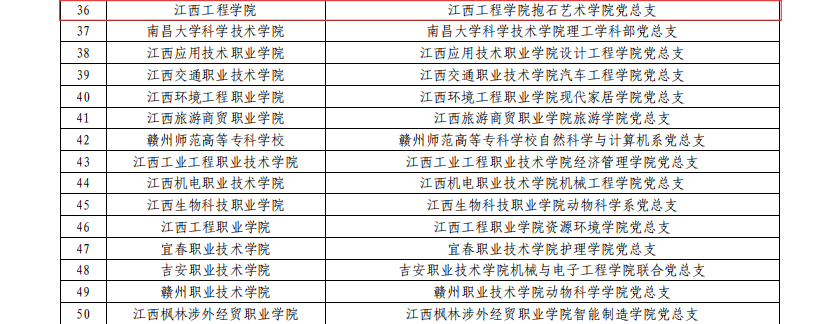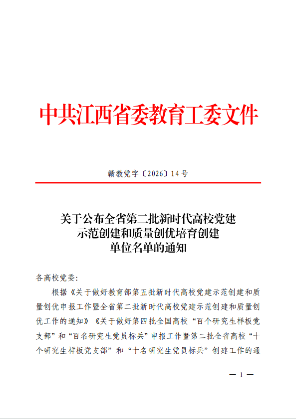 近日,中共江西省委教育工委印发《关于公布全省第二批新时代高校党建示范创建和质量创优培育创建单位名单的通知》(赣教党字〔2026〕14号),遴选产生“全省党建工作标杆院系”50个和“全省党建工作样板支部”102个。抱石艺术学院党总支入选“全省党建工作标杆院系”培育创建单位。这是省委教育工委对学校基层党建工作的充分认可,也是学校推进党建与教育教学、专业建设深度融合的重要成果,体现了学校基层党组织建设的扎实基础与鲜明特色。