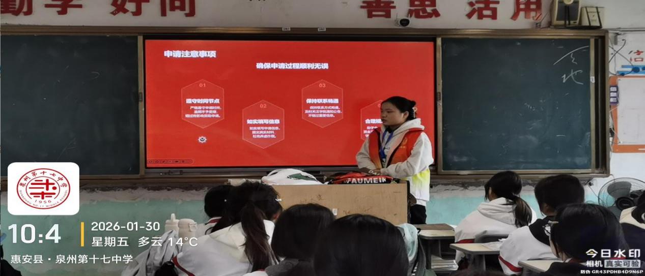 寒假期间,陈苑莹走进泉州第十七中学,利用高三学子课余时间开展国家资助政策宣讲会。宣讲中,她以自制PPT为蓝本,先向学弟学妹们介绍国家资助的核心承诺,阐释“奖、助、贷、补、减、勤”全周期资助保障体系的整体框架,让同学们建立起“政策有保障”的求学信心。针对高三学生最关心的问题,她对核心资助项目进行细致解读,明确国家奖学金、国家励志奖学金的区别与申请条件,鼓励学子以努力换取荣誉与支持;以流程图清晰演示生源地信用助学贷款的申请步骤,着重讲解本专科生最高20,000元/年的额度及在校期间财政贴息的优惠政策,打消大家对学费的顾虑,同时介绍国家助学金、临时困难补助、学费减免等政策,让不同需求的学生都能找到适配的帮扶途径。