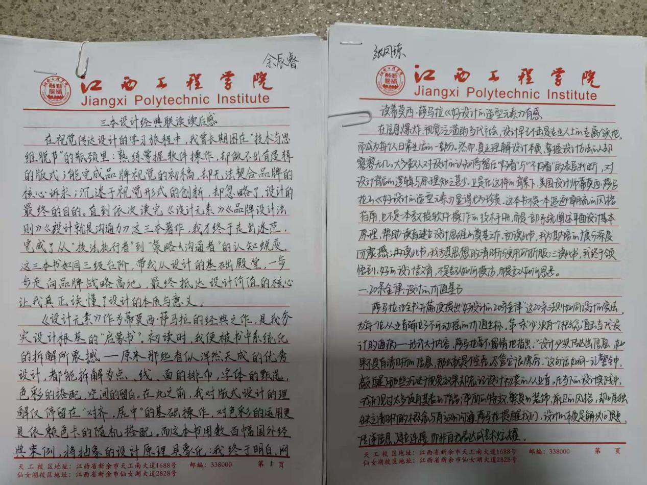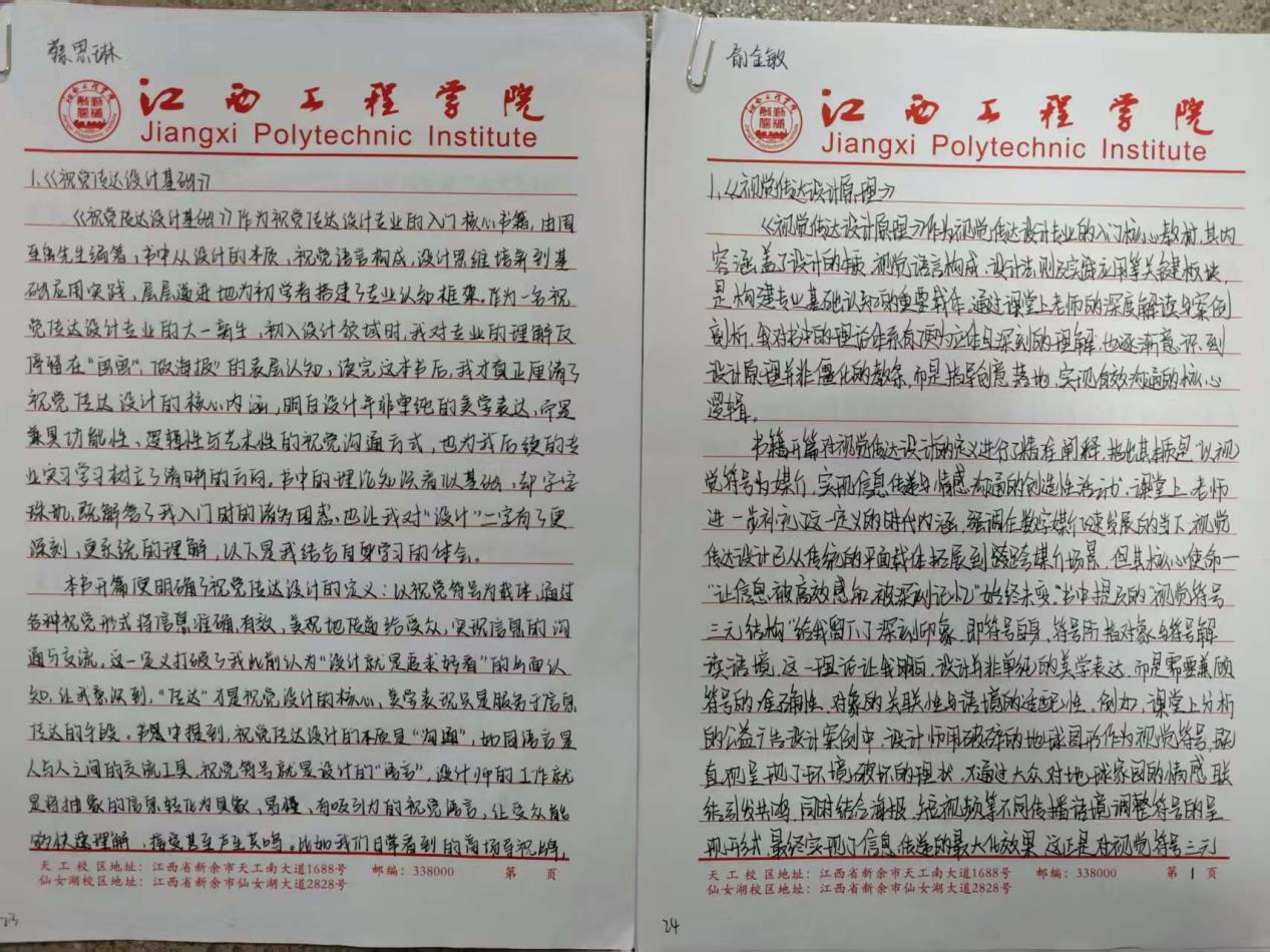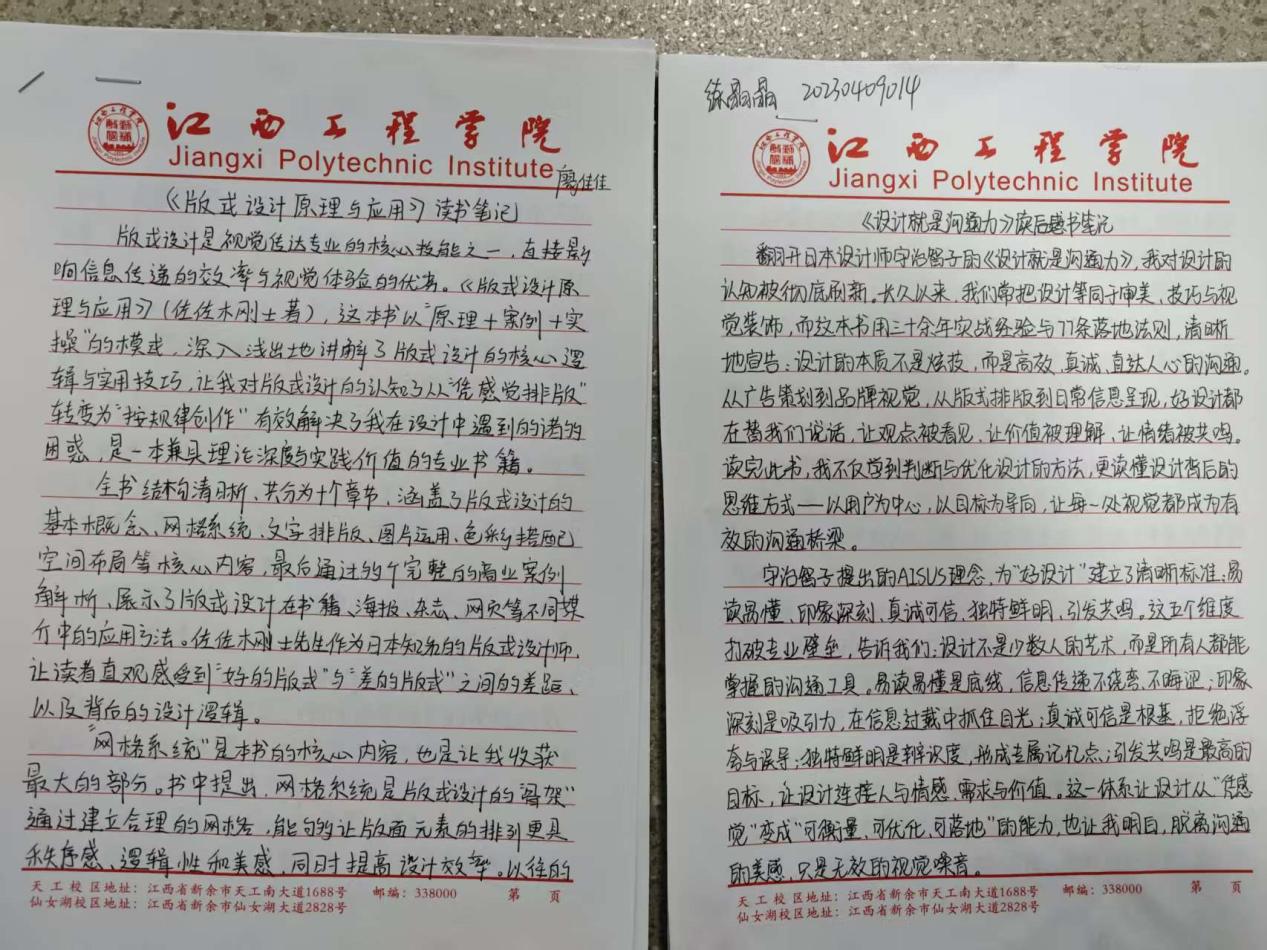 本次优秀读书笔记展示现场,一本本工整的信纸读书笔记整齐陈列,成为校园里一道别样的“书香风景线”。展评的读书笔记中,同学们字迹娟秀工整、卷面整洁规范,既有对艺术设计、美术创作、视觉传达等专业核心知识点的系统梳理、经典理论的摘抄标注,也有结合自身专业学习实践的深度感悟、创作思路的延伸思考,更有对专业问题的探索与见解,充分展现了抱石艺术学院学子扎实的专业素养、勤于思考的学习习惯和认真严谨的学习态度。