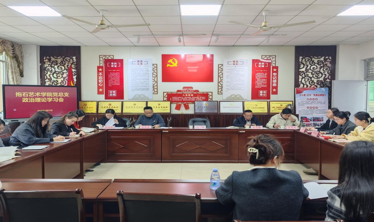 为持续强化理论武装,严格落实“第一议题”制度,切实提升党员教师政治素养与思想觉悟,2026年3月25日下午4时,抱石艺术学院教师第一党支部在艺术楼202会议室召开政治理论学习会。会议由学院党总支书记刘永东主持,教师第一党支部全体党员参会,聚焦政治理论学习、思想作风建设与学院事业发展开展集中学习研讨。