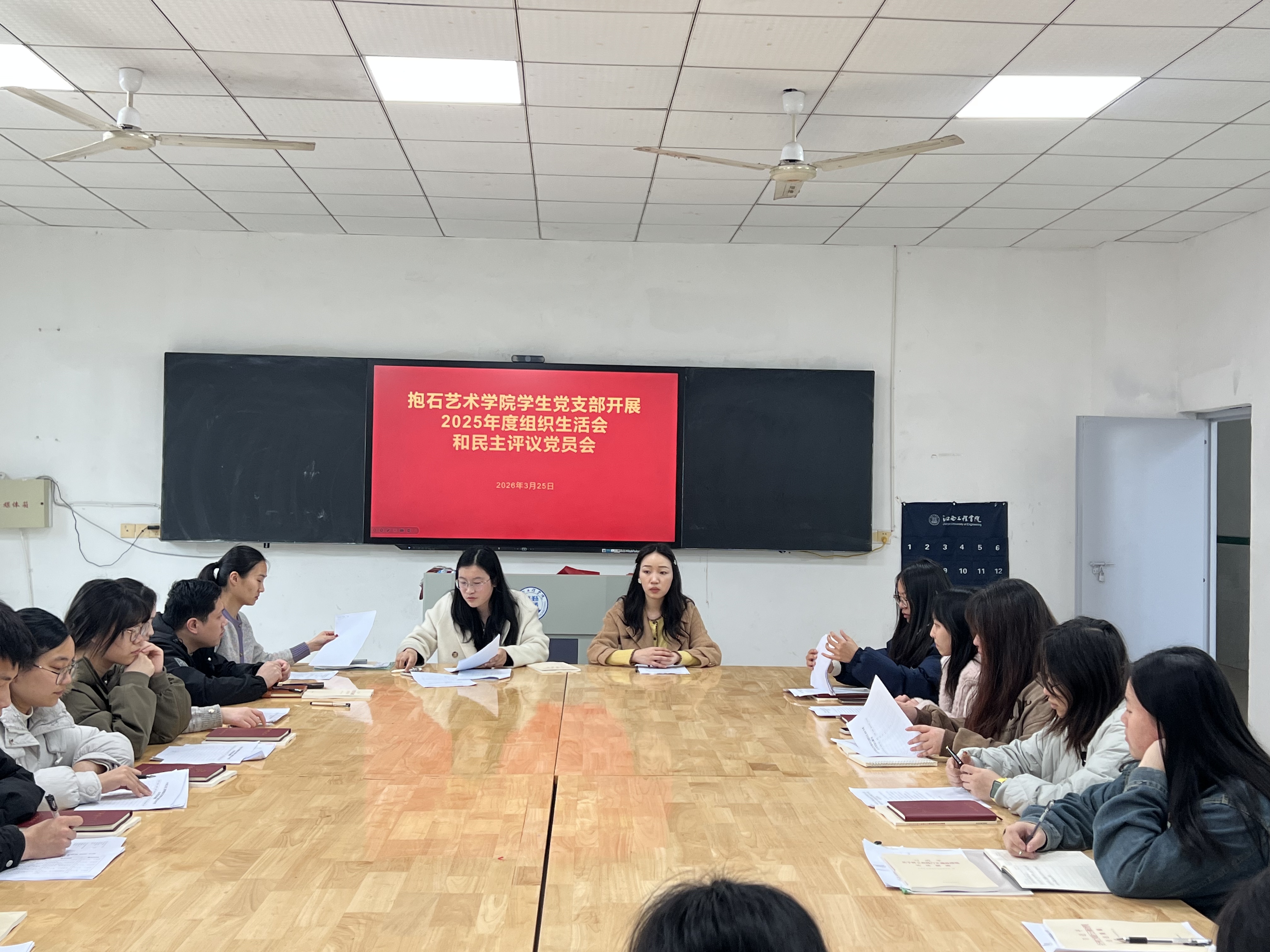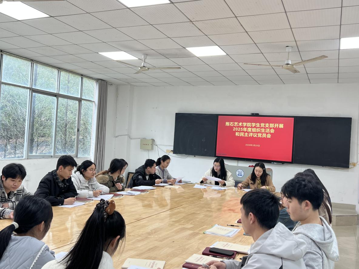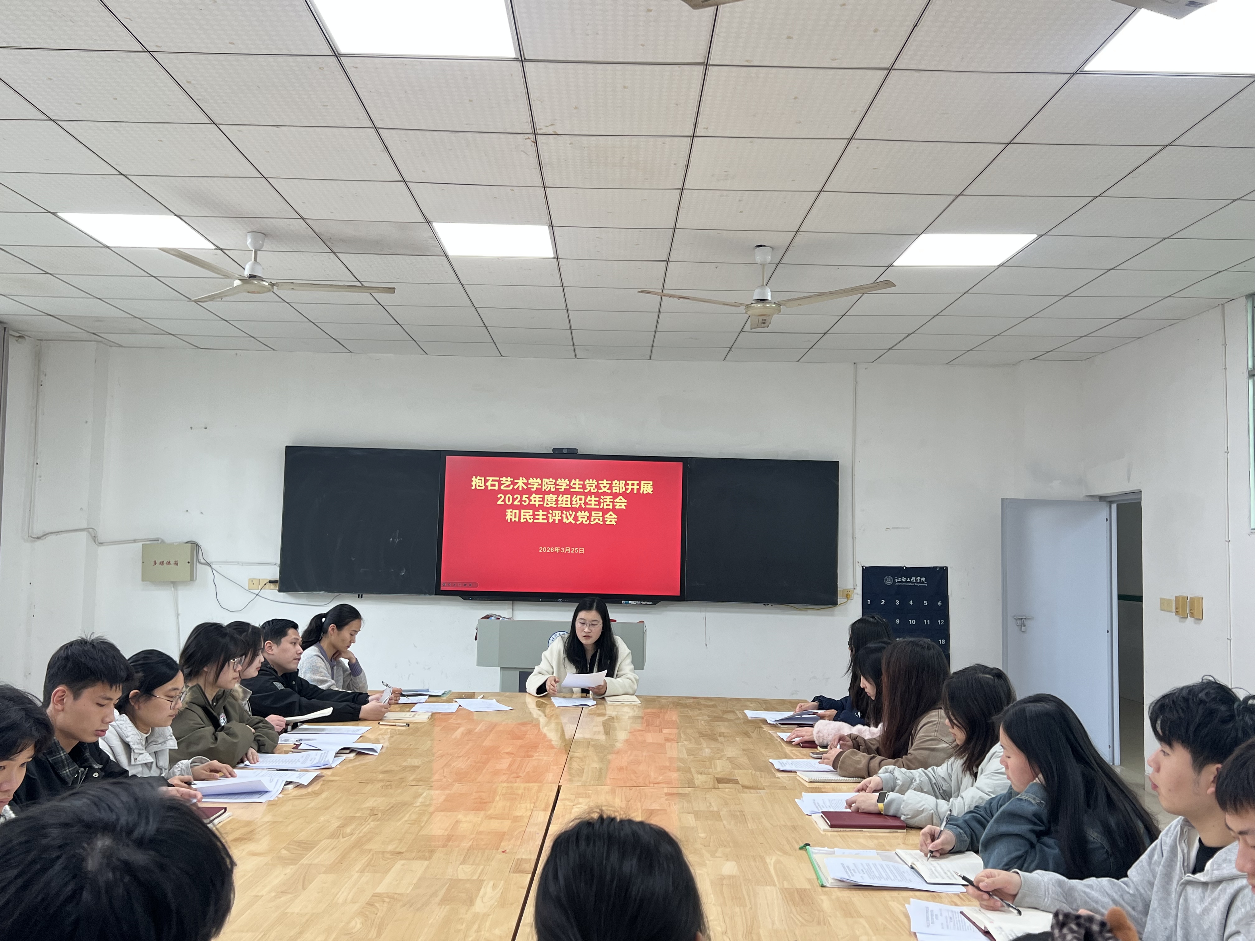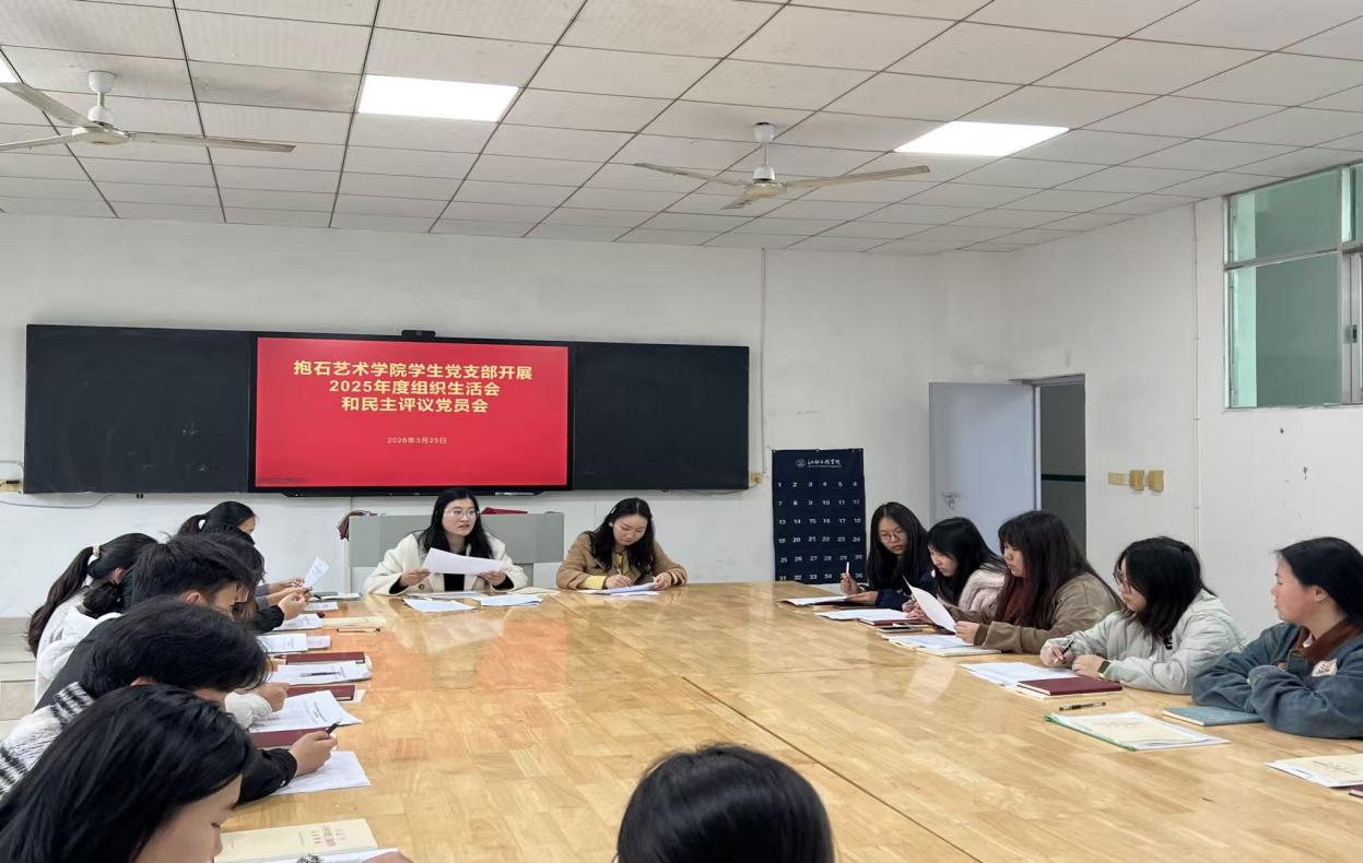 为深入学习贯彻习近平总书记重要讲话精神,全面推进支部建设高质量发展,2026年3月25日下午2时,抱石艺术学院学生党支部在艺术楼304教室召开2025年度组织生活会暨民主评议党员会议。支部全体党员、预备党员及入党积极分子代表参会,会议由学生党支部书记叶丽同志主持。