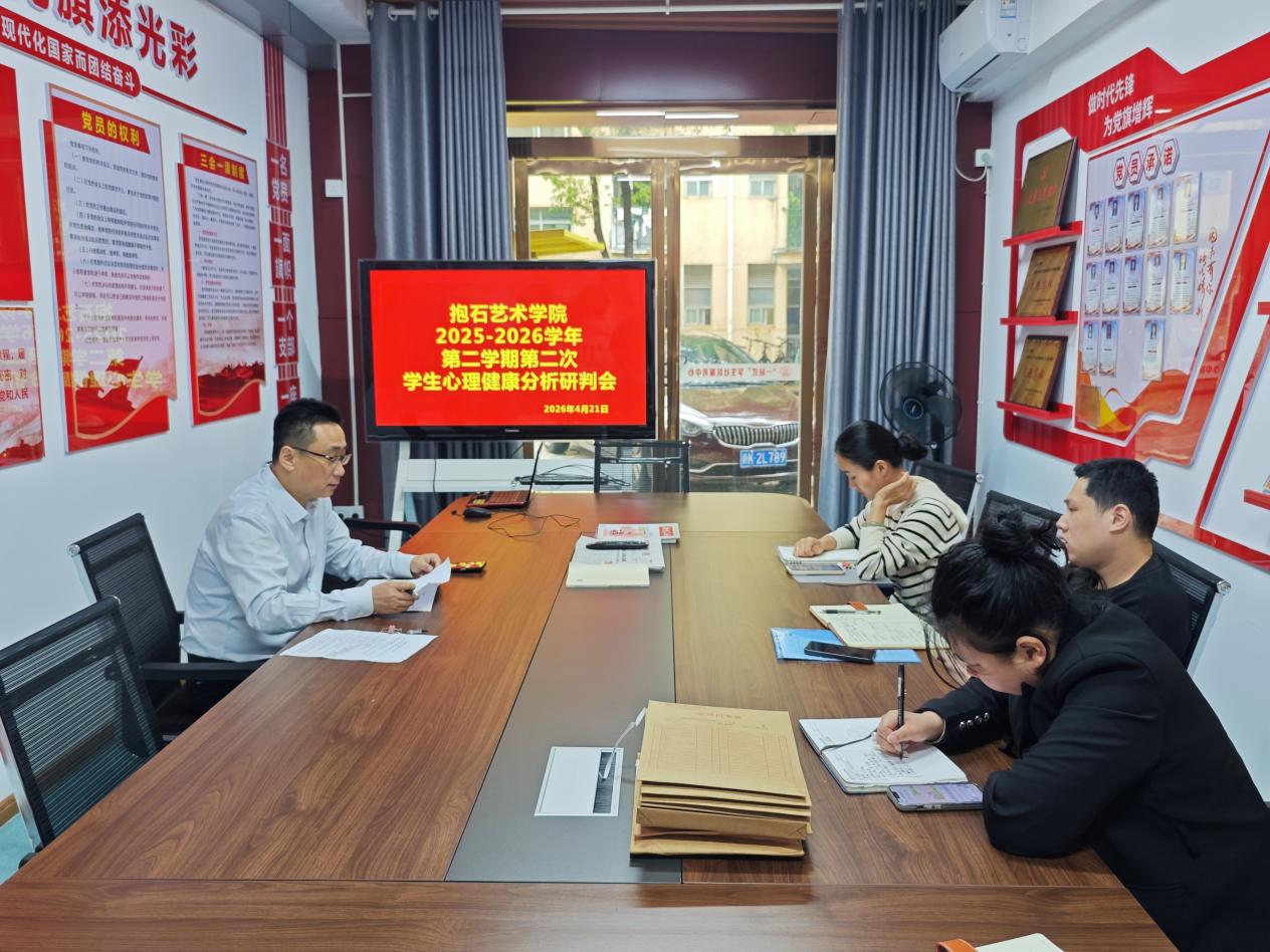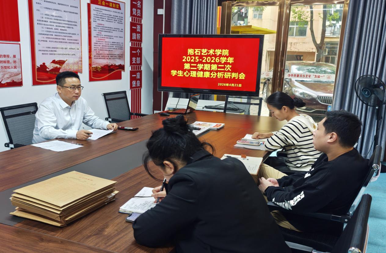 为持续筑牢学生心理健康防线,精准掌握学生心理健康状况,及时排查化解心理风险隐患,切实提升学生心理健康教育工作的针对性和实效性,护航学生健康成长、全面发展,2026年4月21日上午10时,抱石艺术学院在红光社区党员活动室召开2025-2026学年第二学期第二次学生心理健康分析研判会。学院党总支书记刘永东出席会议,全体辅导员参加会议。