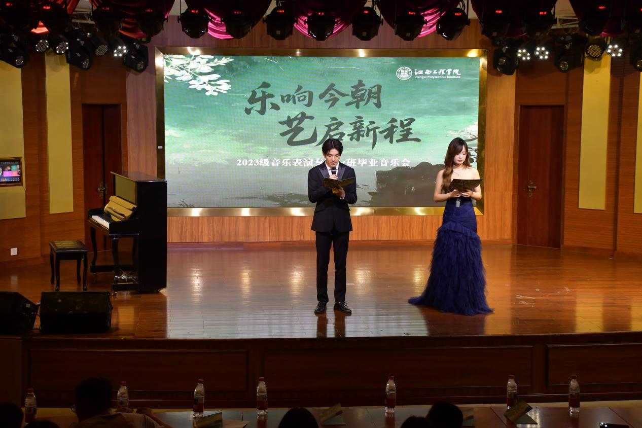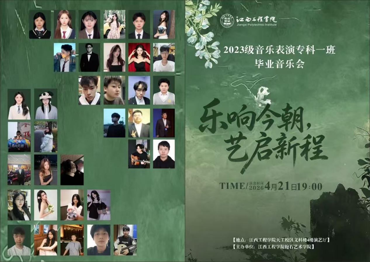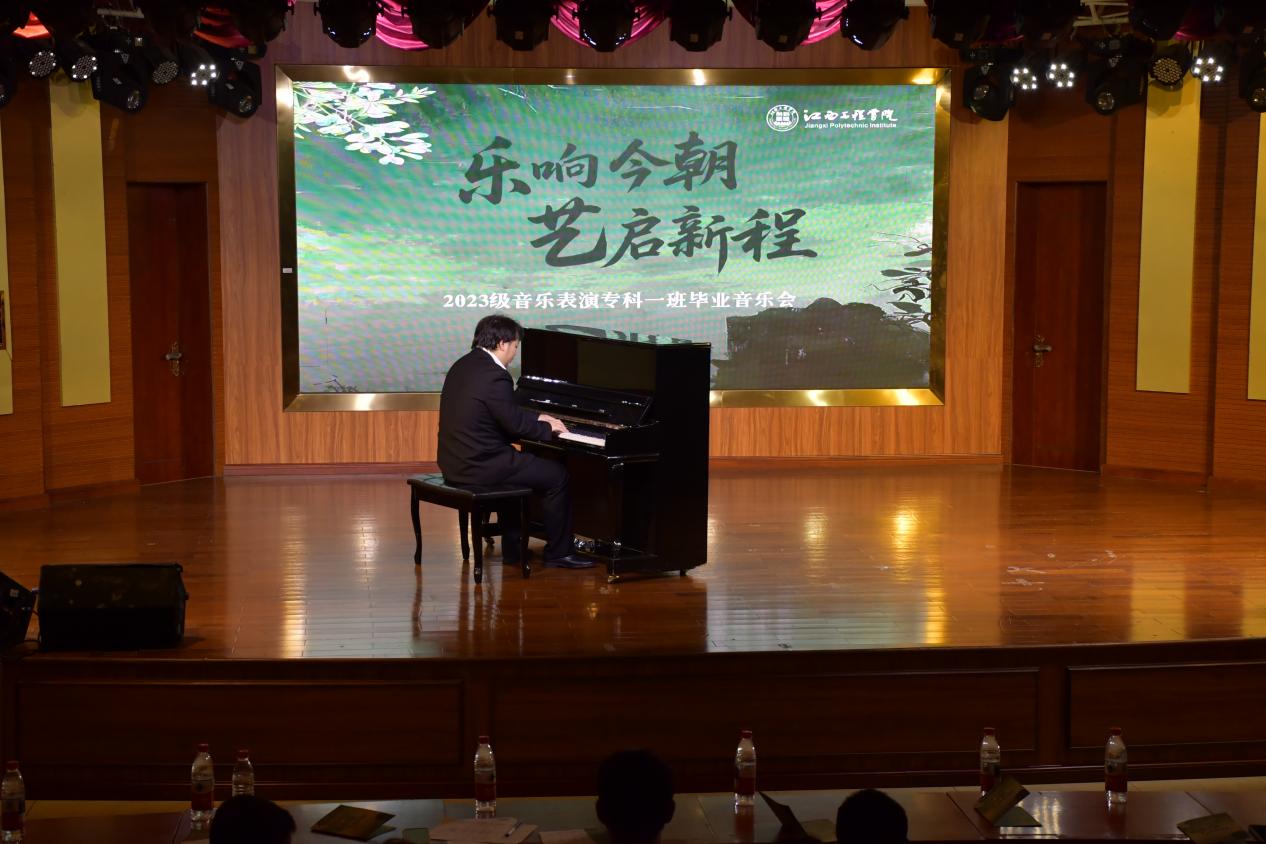 青春如歌,岁月流金。为集中展示音乐表演专业人才培养成果,献礼毕业生奔赴新程,2026年4月21日晚7时,江西工程学院抱石艺术学院2023级音乐表演专科1班毕业音乐会在天工校区文科楼4楼演艺厅举行。这场以“乐响今朝 艺启新程”为主题的音乐会,汇聚了20首精心编排的曲目,成为学子们献给青春与母校的专属乐章。学院党总支书记刘永东、学院部分专业教师到场观看演出,与全体毕业生欢聚一堂,共赴这场以乐传情、以艺筑梦的青春汇演。