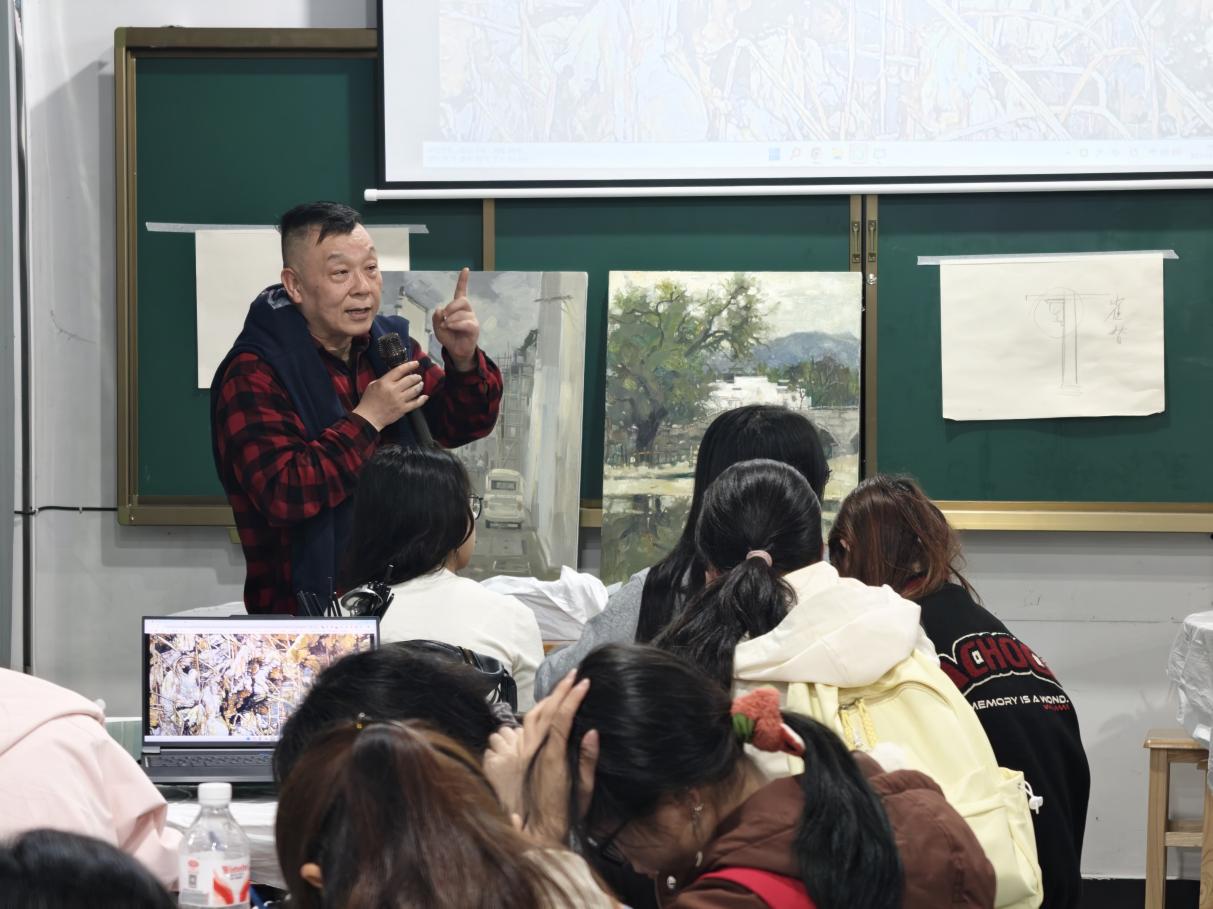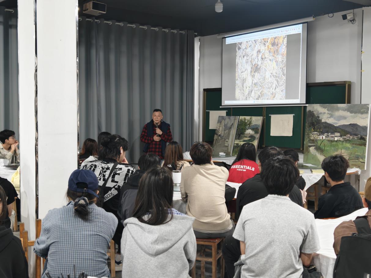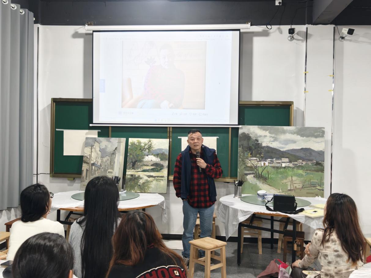 现场互动热烈,萧老师耐心解答同学们的疑问,细致指导写生技巧。同学们表示,讲座干货满满,既领略了皖南油画的魅力,又掌握了实用方法,对后续写生与创作极具启发。